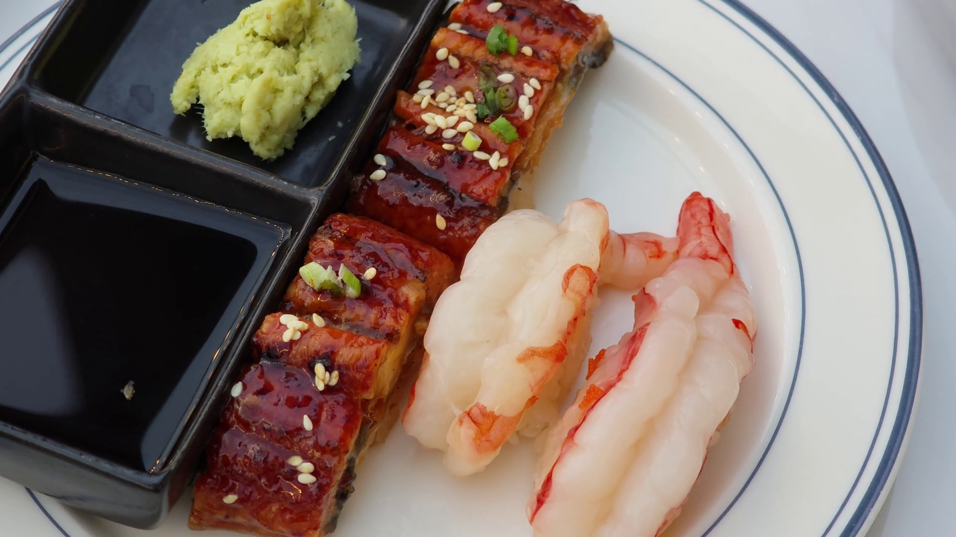 A Delicious Platter Featuring Sushi Rolls Shrimp And Wasabi Served With Soy Sauce On A Classic White PlateÂ