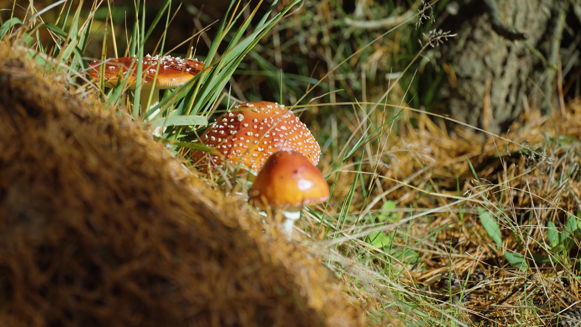 A Fly Agaric Mushroom On The Forest Floor Along With Decaying Leaves Grass And Tiny Shrubs A Closeup Shot Slowmotion Pan Right