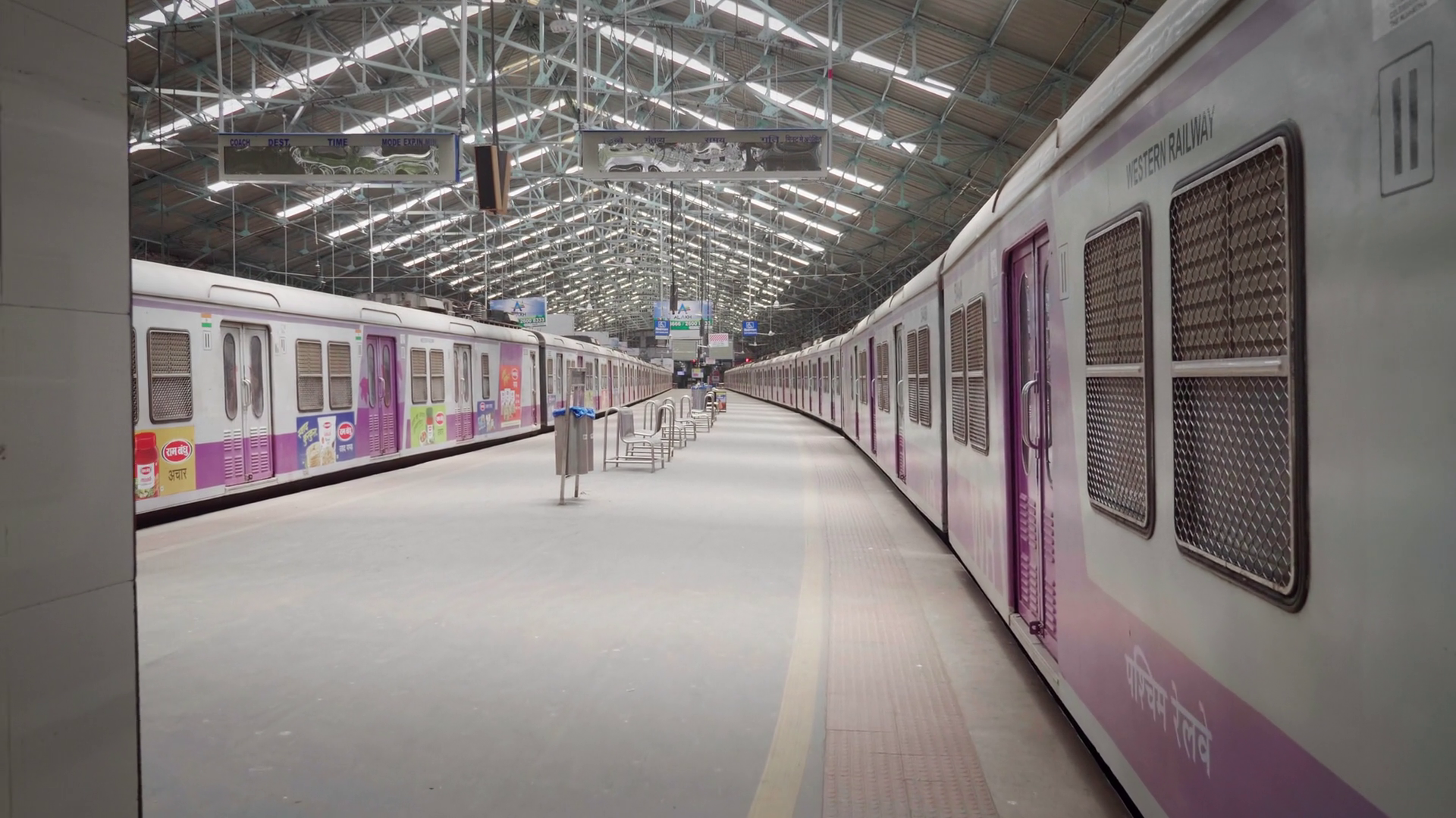 A Moving Shot Of The Empty Local Or Suburban Trains Standing At The Empty Churchgate Railway Station During Corona Virus Or Covid 19 Epidemic Or Pandemic Lockdown Times Â