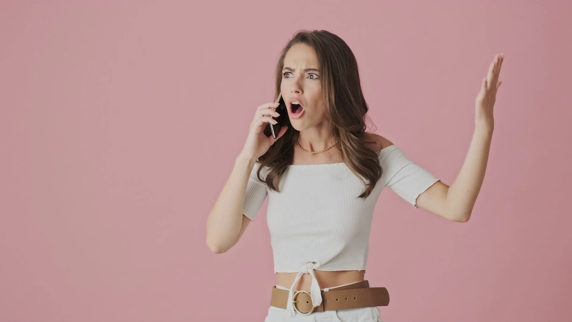 A Serious Angry Young Woman Is Talking On Her Smartphone Standing Isolated Over A Pink Background In StudioÂ