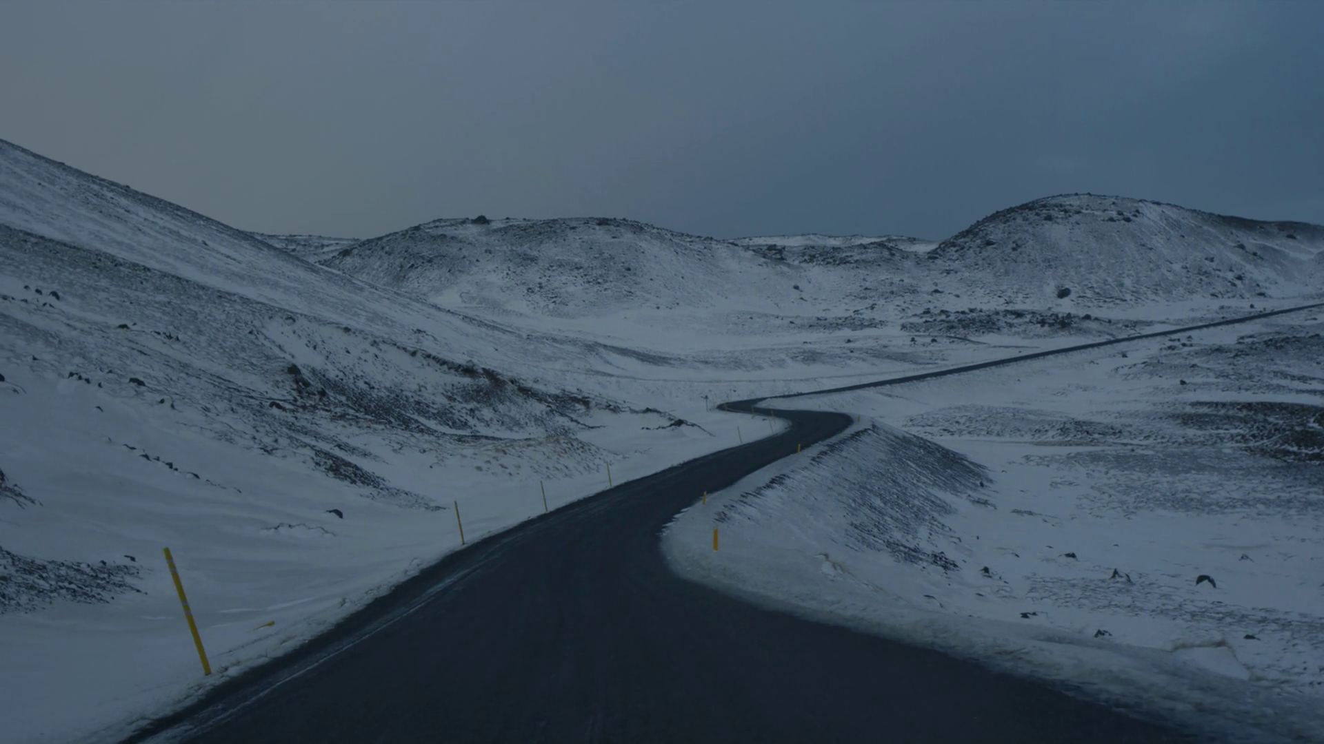 A Snow Covered Road Disappears Into The Arctic Landscape Of Iceland With A Heavy Sky Looming OverheadÂ