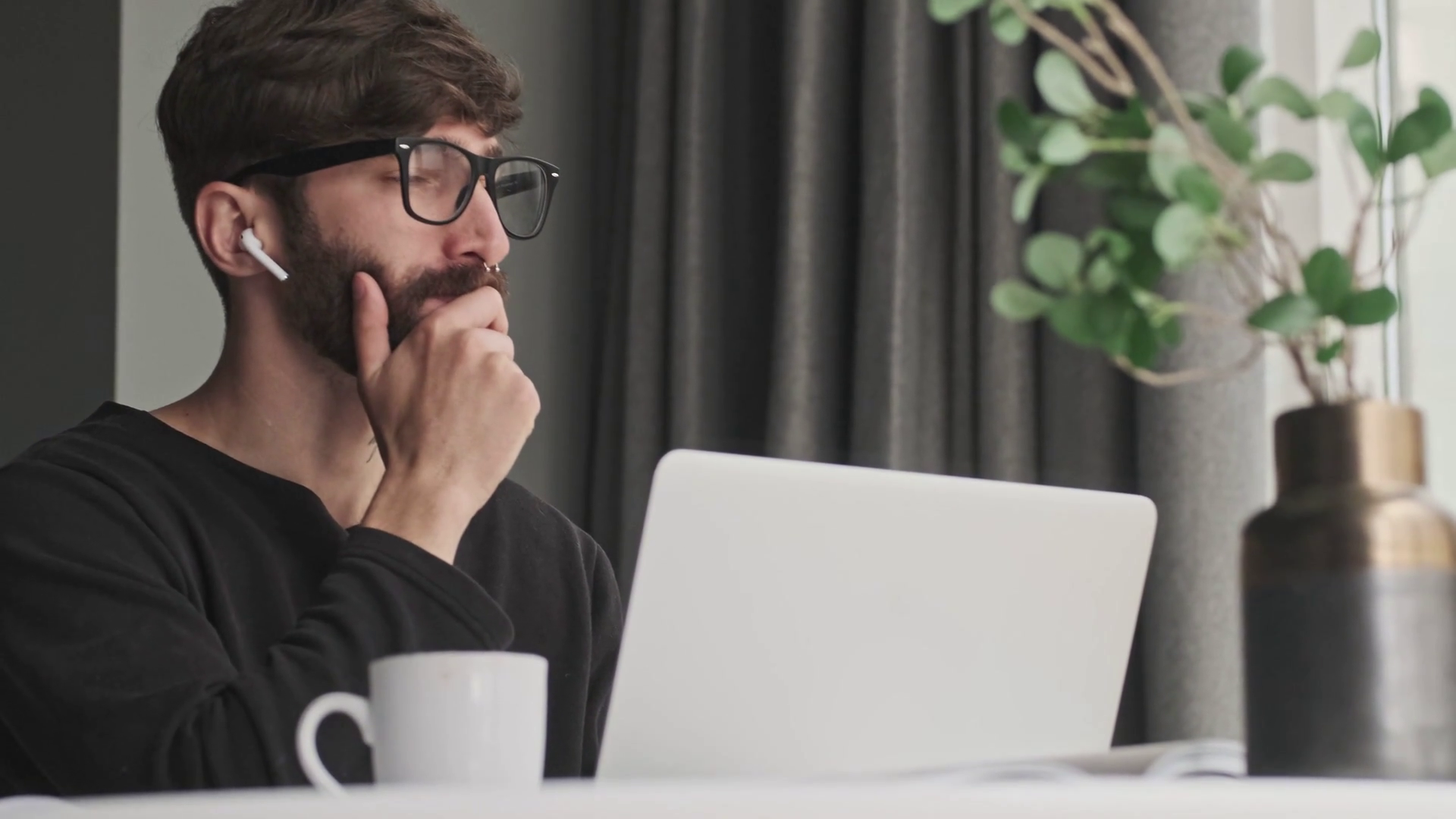 A Thinking Young Hipster Man With Earbuds Wearing Glasses Is Using His Laptop Computer In The Living Room At HomeÂ