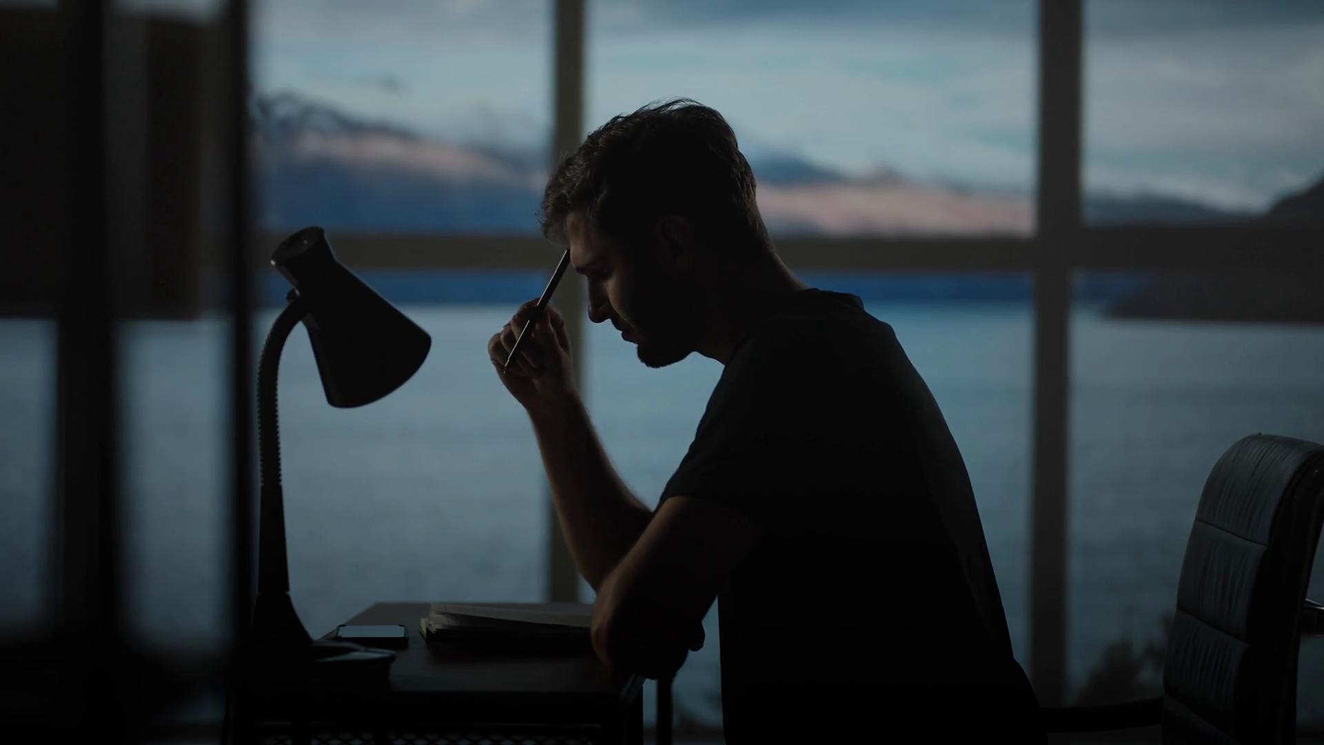 A Thoughtful Man Sitting At A Table With A Desk Lamp Writes With A Pen Dark Time Of The Day Twilight On The Background Of The Window A Sad Man Thinks And WritesÂ