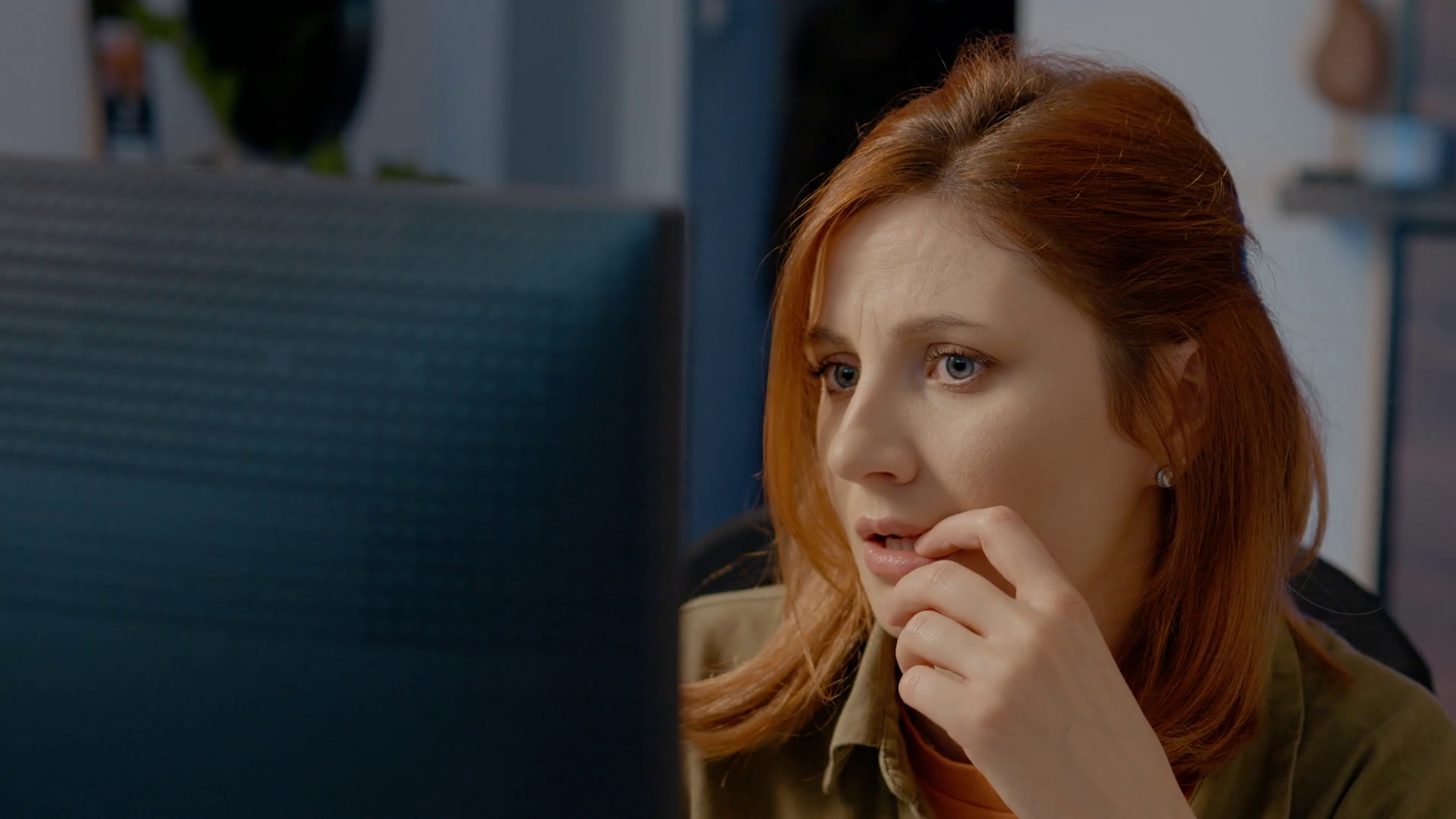 A Woman Appears Shocked And Thoughtful As She Reads Something Unsettling On Her Computer Her Worried Expression Captures The Moment Of Confusion And ConcernÂ