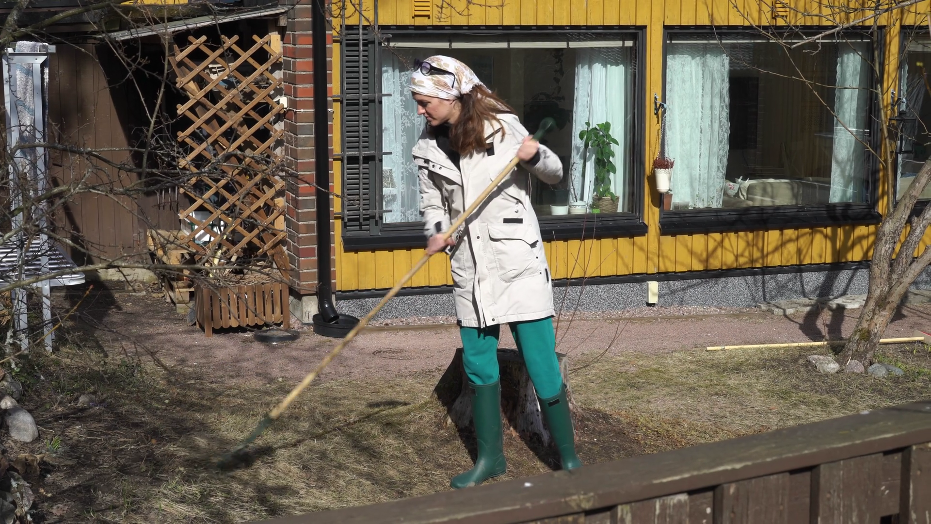 A Woman In Outdoor Clothing Raking Leaves And Dead Clearing A Garden In Early Spring The Scene With Natural Spring Sunlight Seasonal YardÂ
