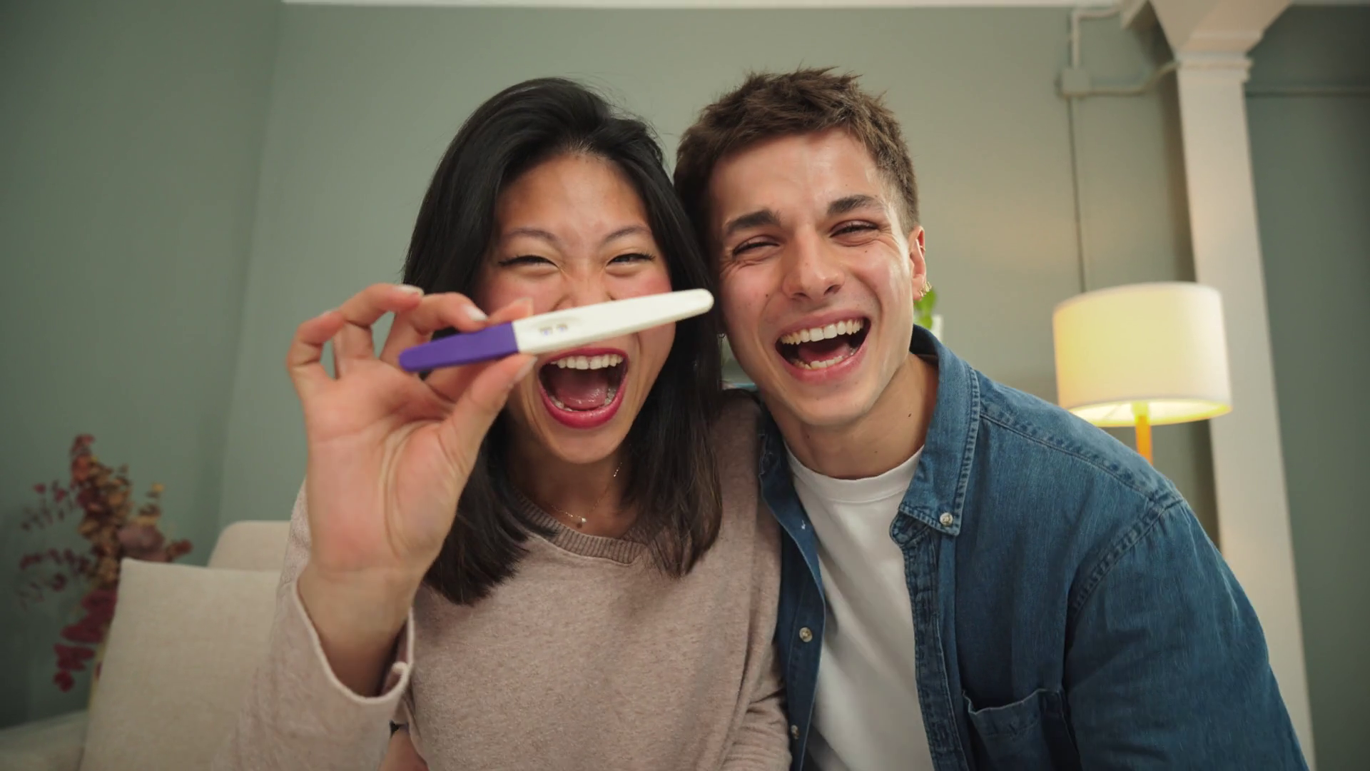 A Young Couple Showing A Positive Pregnancy Test To The Camera On A Video Call Conference At Home Mother And Father Feel Happy About TheirÂ