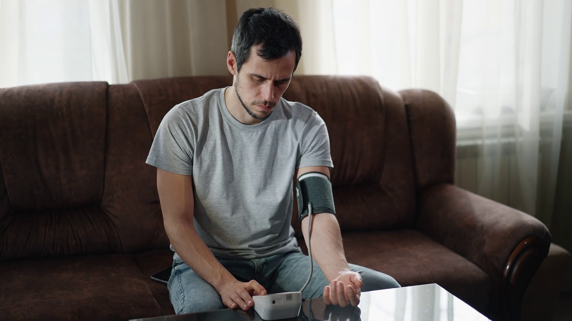 A Young Man Measures His Blood Pressure Using A TonometerÂ