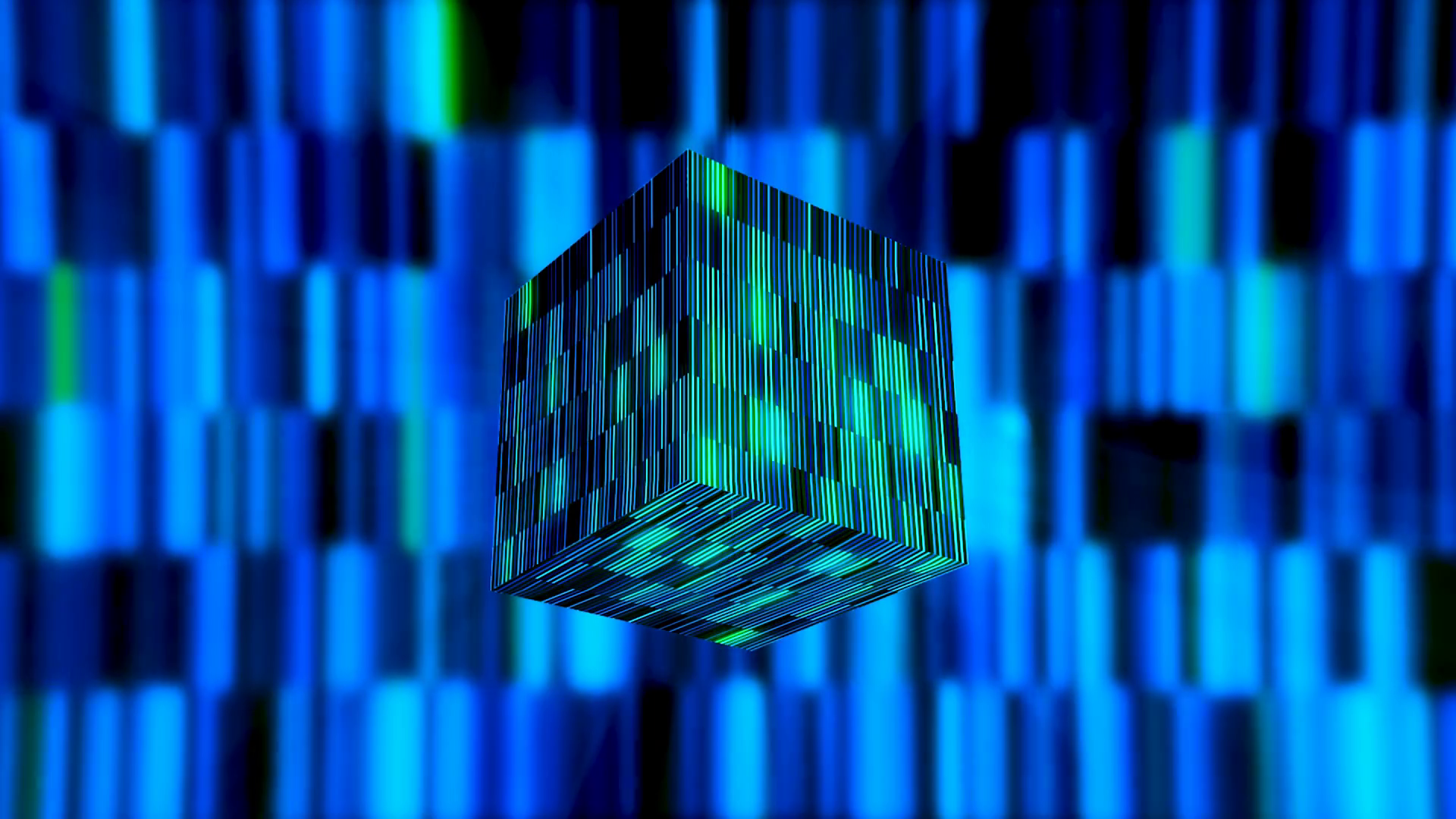 Abstract Glowing Cube With Blue Rays Of Light Motion Striped Neon Cubic Shapes Falling Apart On Shimmering Background