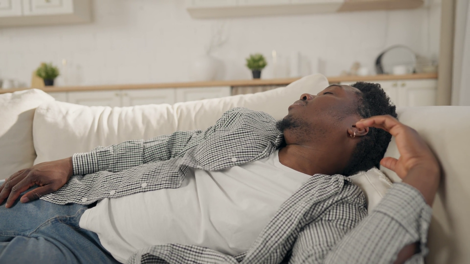 Adult African American Man Sleeping On Couch In Weekend Afternoon Nap Relax Recovery Of Energy Daytime Sleep Young Black Guy RestingÂ