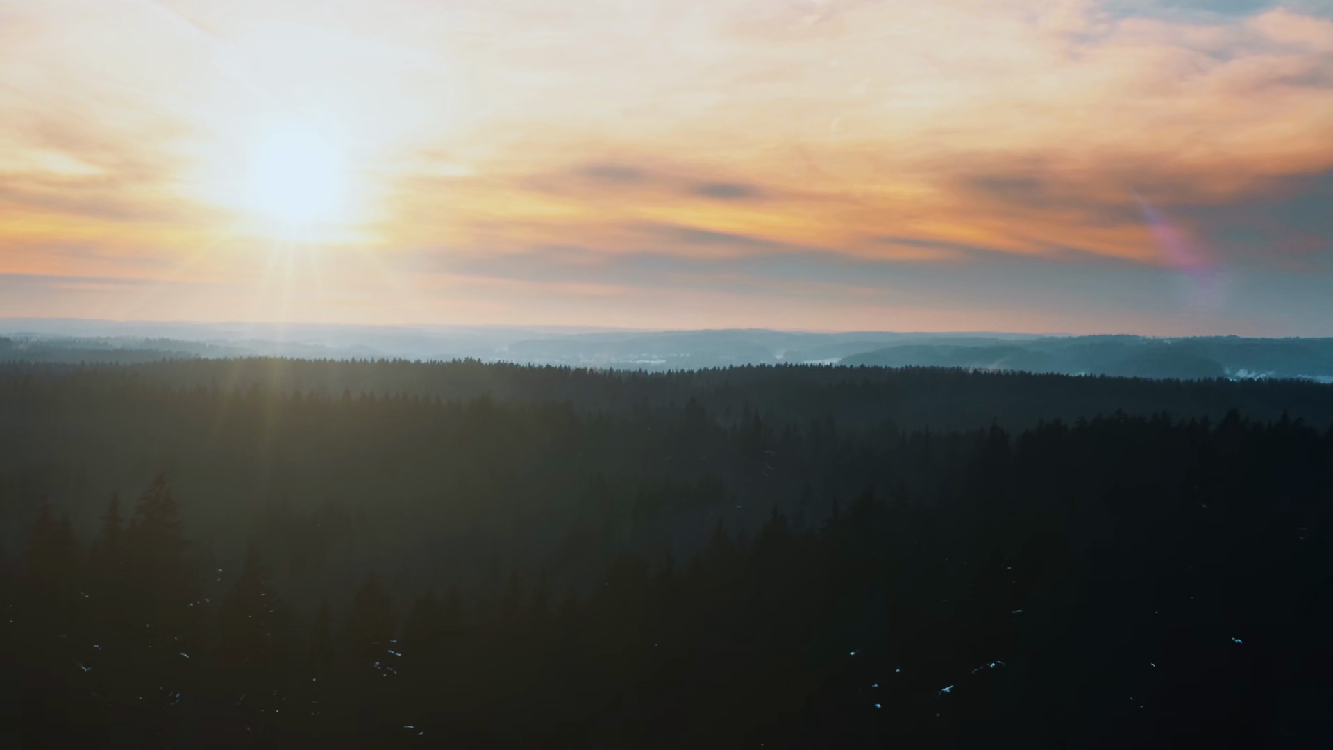 Aerial Beautiful Spring Forest In Sunrise Or Sunset Light Panorama Top View Hilly Area Woodland Lit With Morning Sunlight Sun Beams Drone Flying Over Treetops Colorful LandscapeÂ