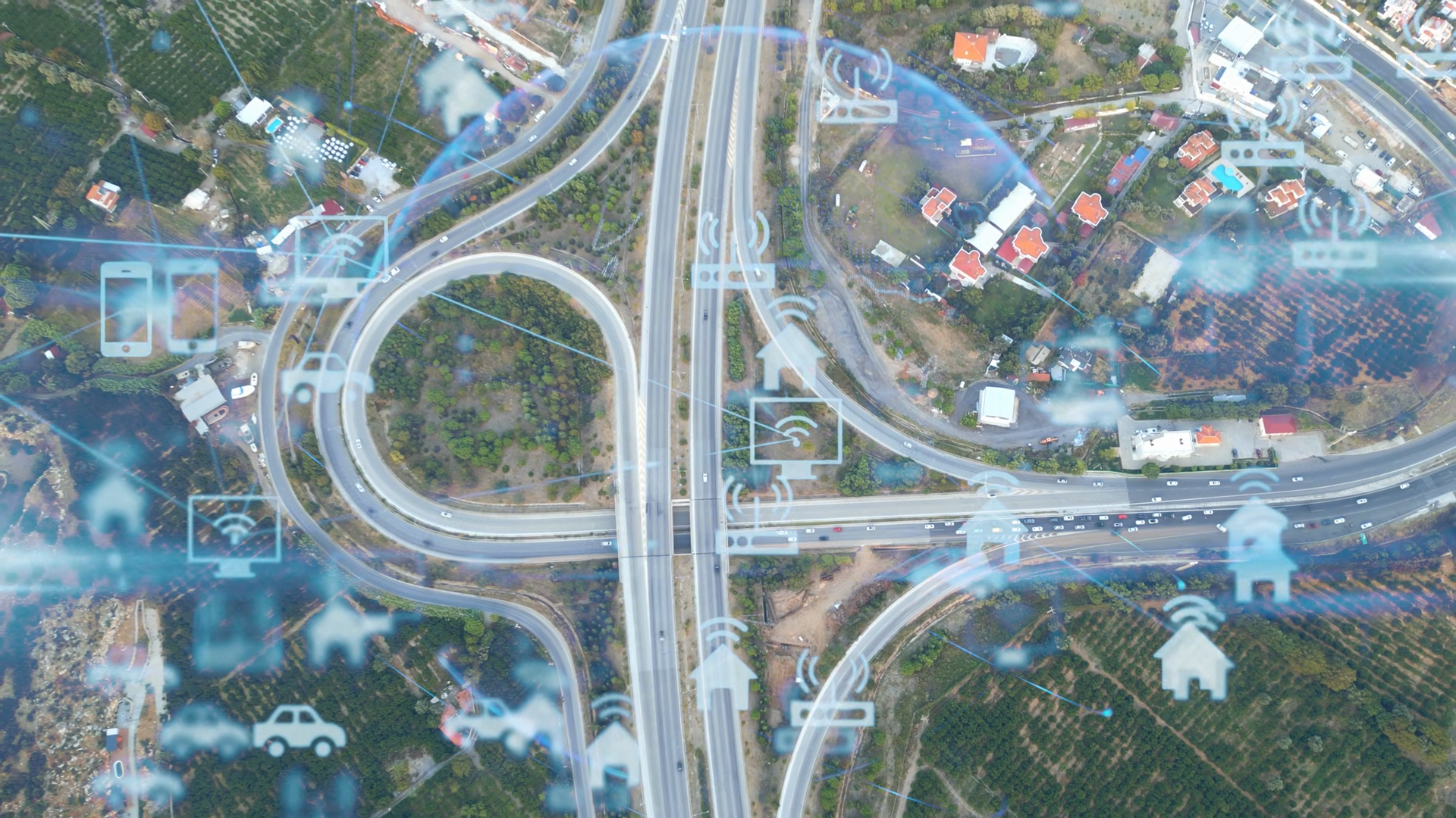 Aerial Crossing With Digital Overlays Demonstrating Autonomous Routing And Glowing StreamsÂ