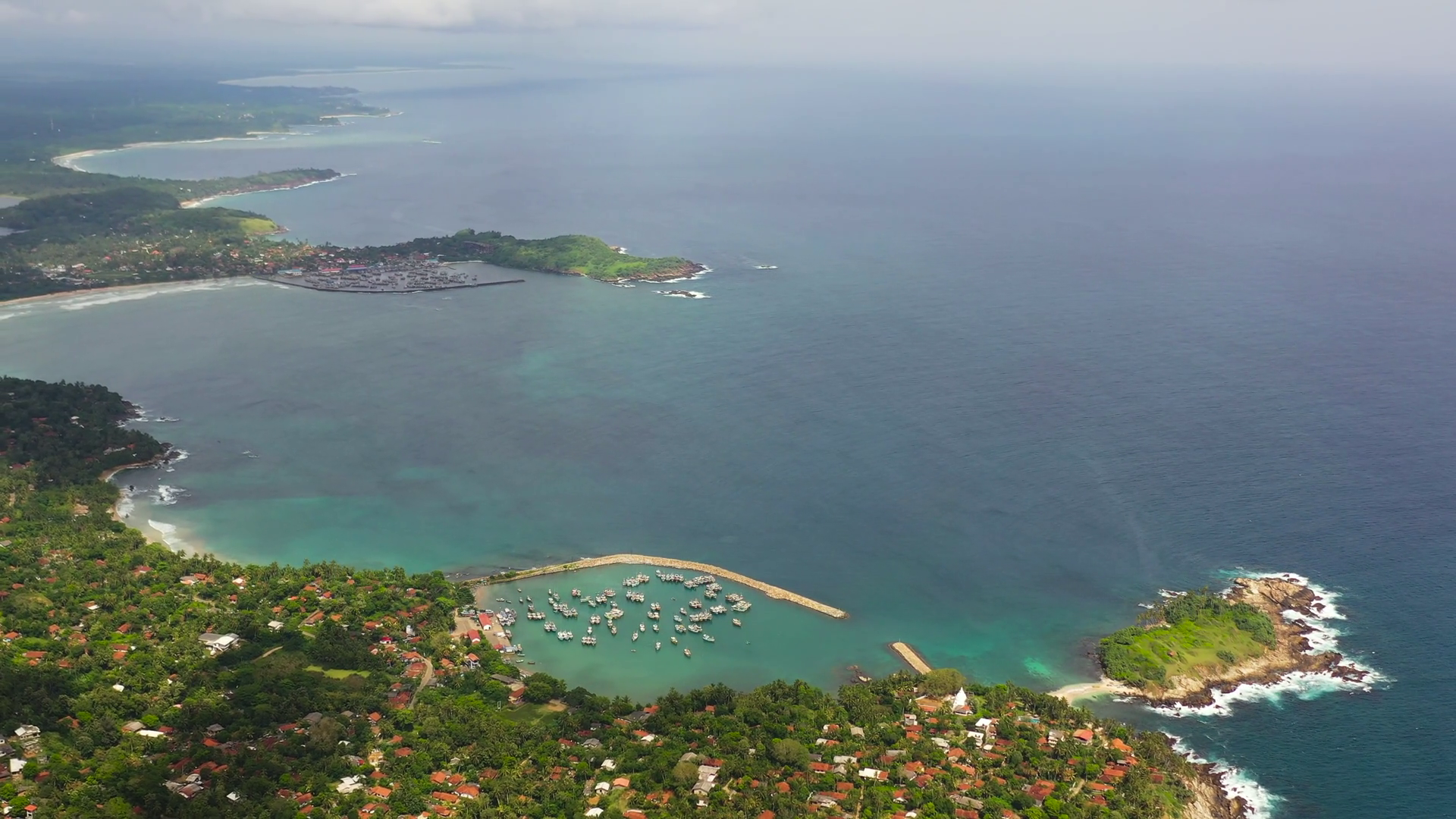 Aerial Drone Of Coastline With A Beach And Hotels Among Palm Trees Sri LankaÂ