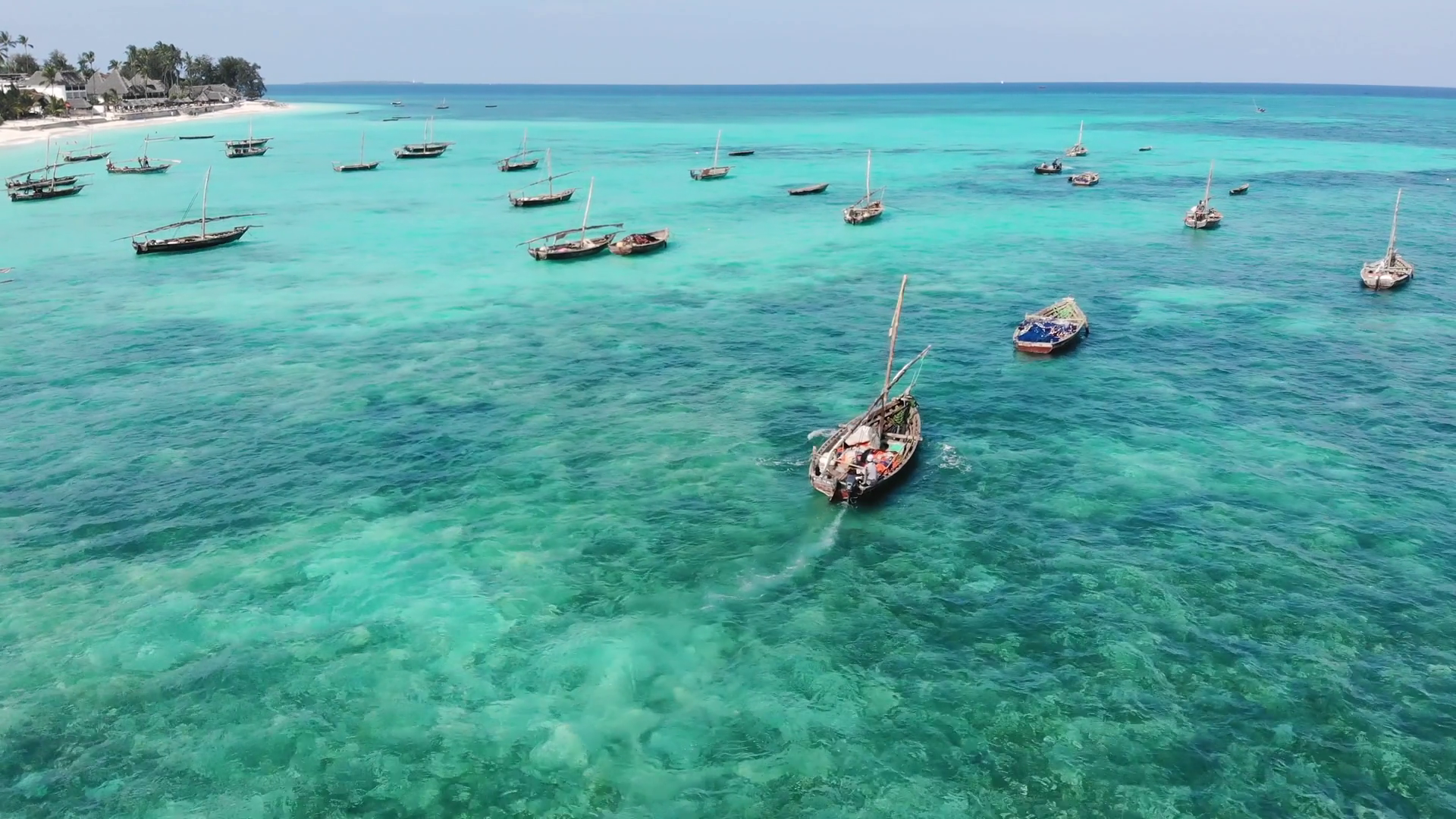 Aerial Drone Shot Of Traditional Boats Near The Beautiful Coastline At ZanzibarÂ