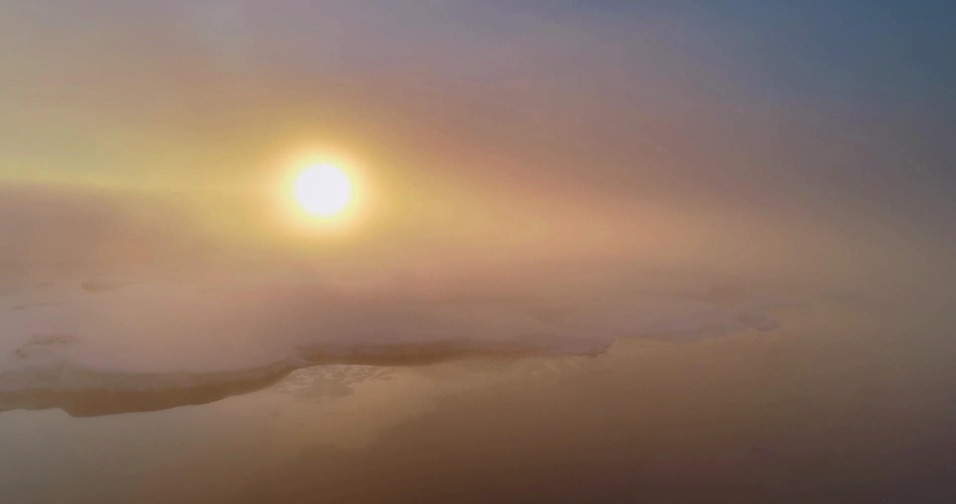 Aerial Fly Over Sunrise Fog Sky In Antarctica Morning Sun Shine Through Clouds On Snow Covered Hill Mountains Ocean Epic Panorama OverviewÂ