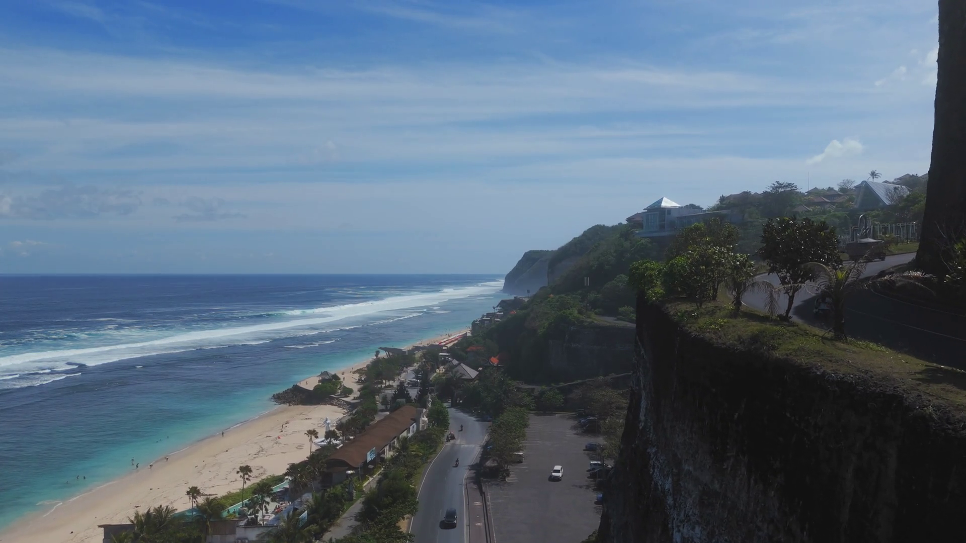 Aerial View Glides Along The Bukit Peninsula Cliff Above Melasti Beach Bali Revealing Villas Winding Road And Rolling Surf BelowÂ