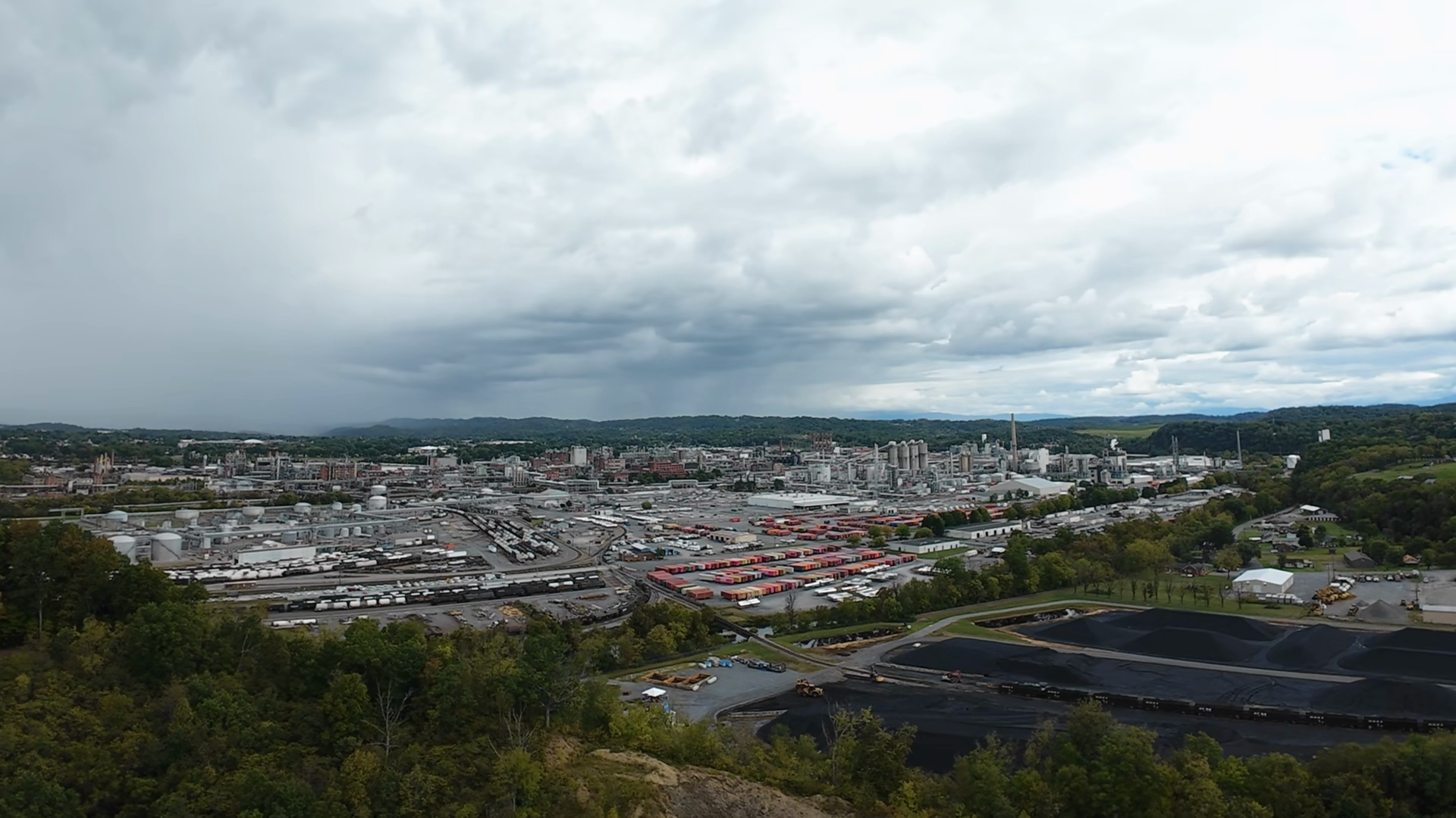 Aerial View Kingsport City Skyline With Looming Storm Clouds Downtown Blocks And Industrial Roofs Rail Corridor And Coal Stockpiles In