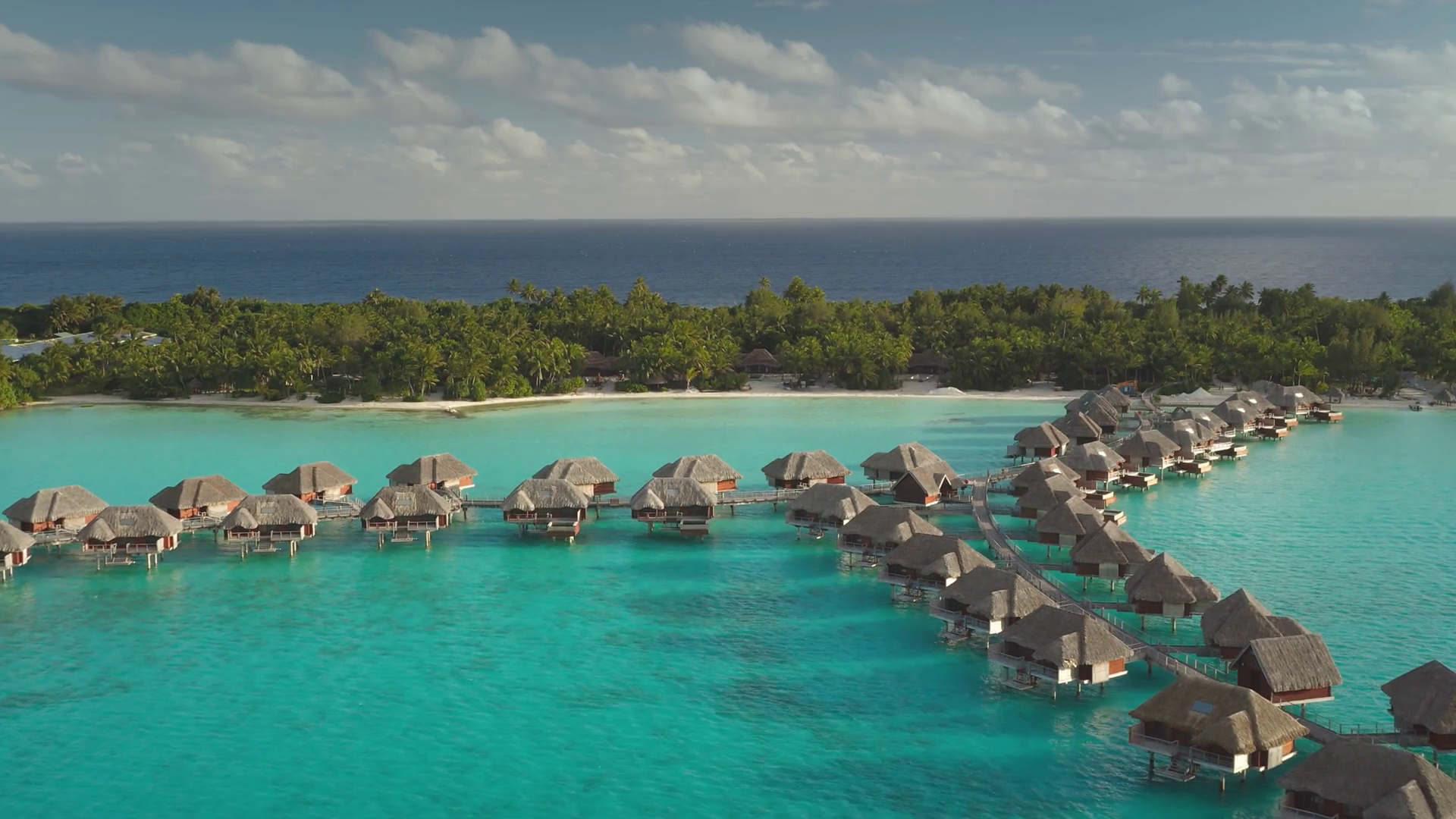 Aerial View Luxury Overwater Bungalows Resort Nestled On Pristine Tropical Island With Turquoise Water And Lush Green Palm Trees BeachÂ