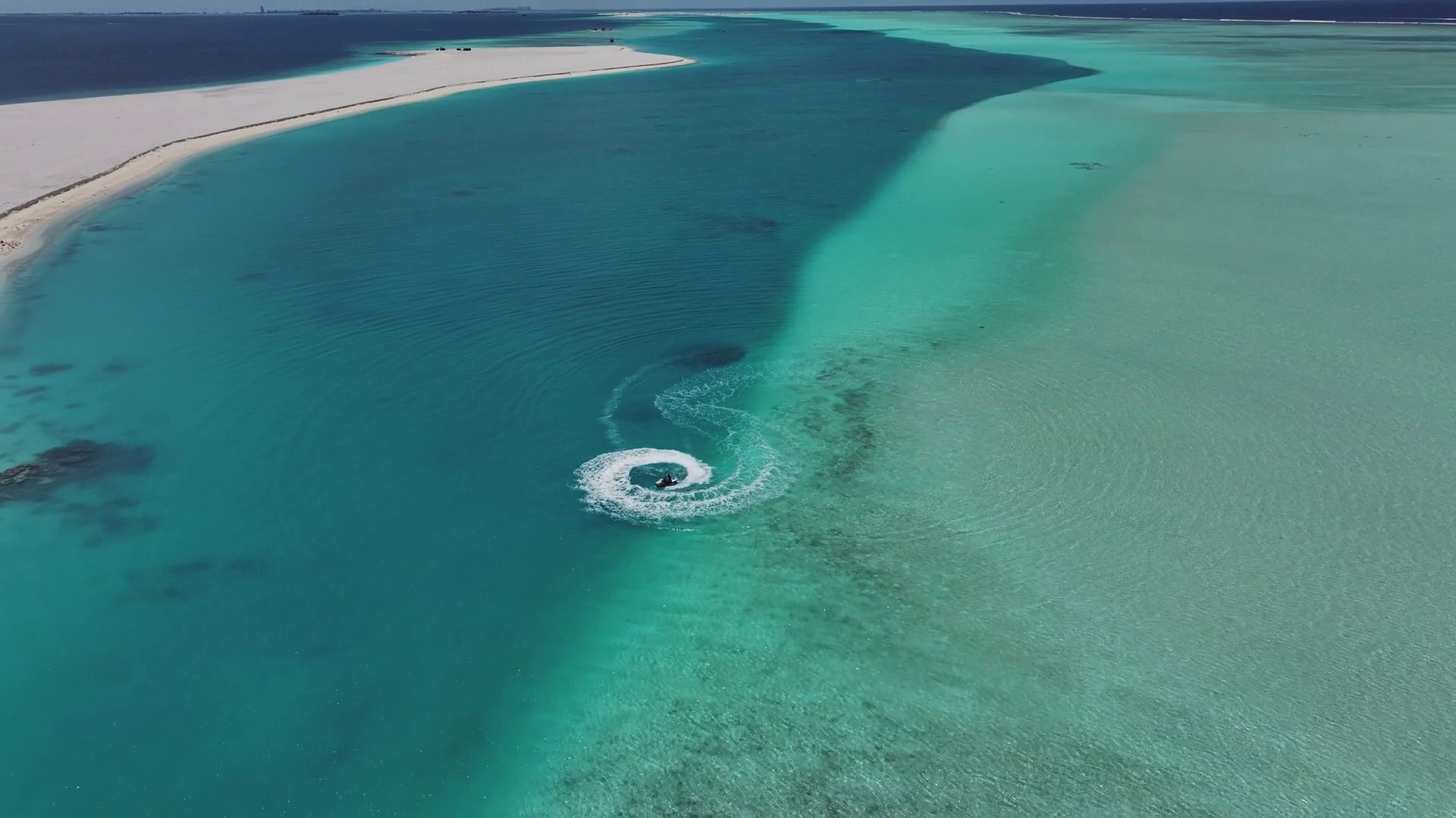 Aerial View Of A Jet Ski Leaving A White Trail In The Vividly Turquoise Water Near The Sandy Beach Gulhi Southmaleatoll MaldivesÂ