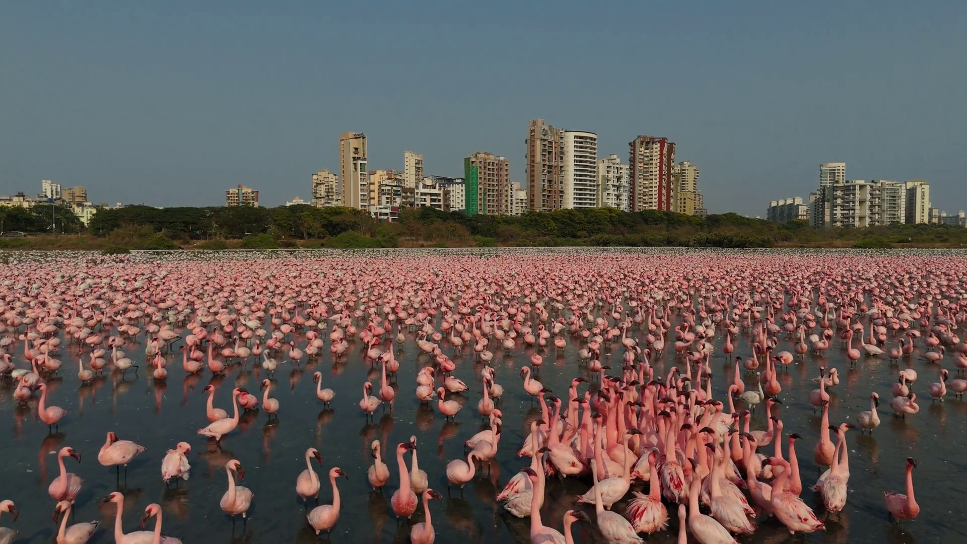 Aerial View Of A Large Flock Of Flamingos Wading In The Water Near Buildings Under A Clear Sky Navi Mumbai Maharashtra IndiaÂ