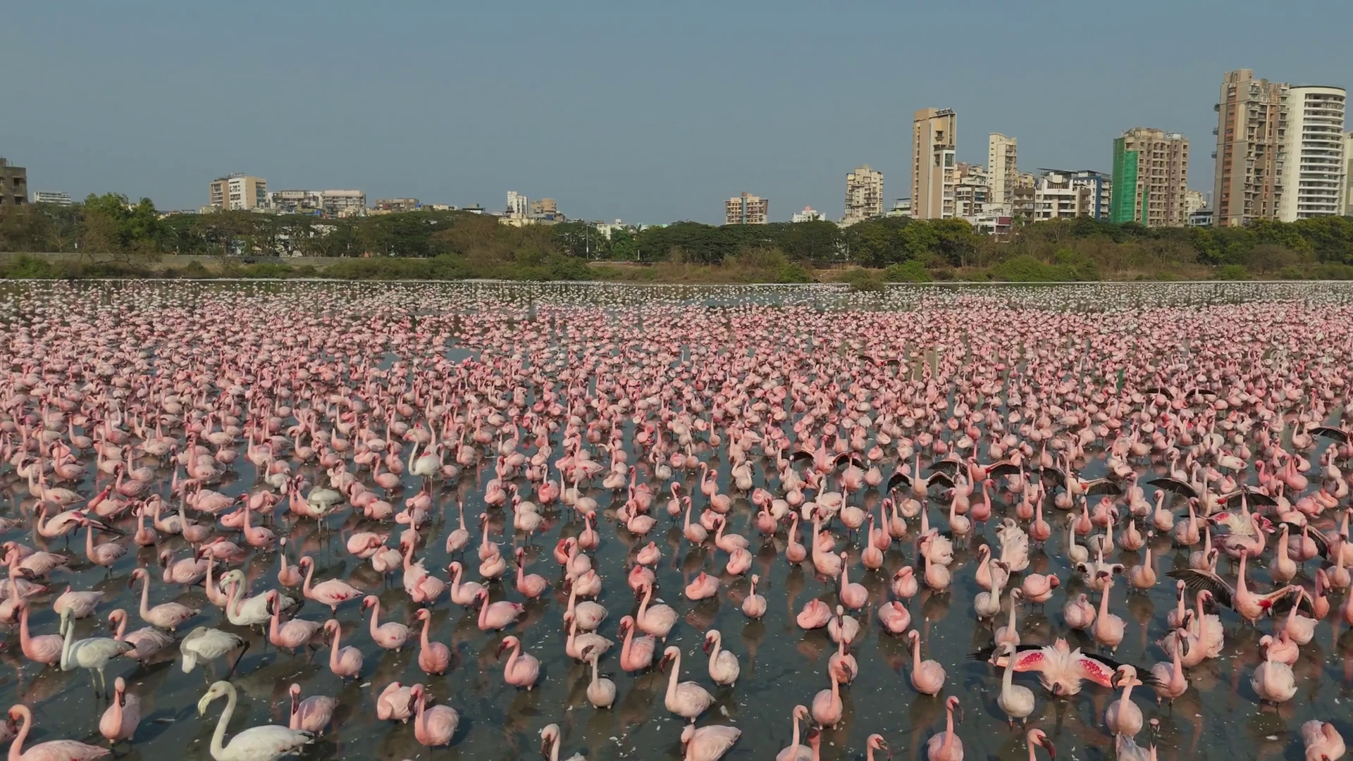 Aerial View Of A Large Flock Of Pink Flamingos Standing In Shallow Water With Buildings In The Background Navi Mumbai Maharashtra IndiaÂ