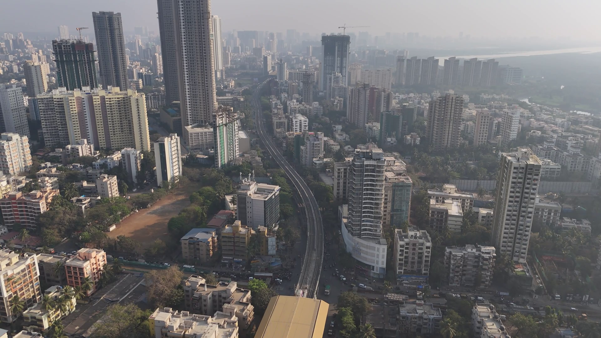 Aerial View Of A Metro Train Cutting Through A City Lined With Buildings Of Varying Heights Mumbai Maharashtra IndiaÂ