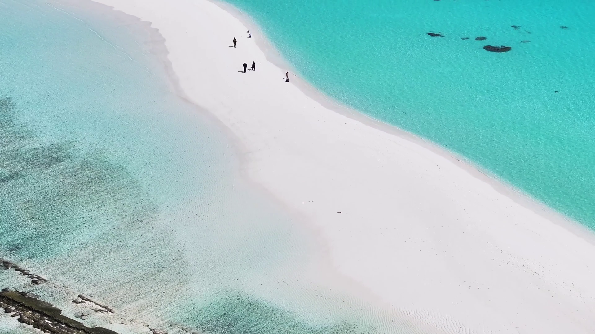 Aerial View Of A Pristine White Sand Beach Meeting Crystal Turquoise Water With Scattered Figures Enjoying The Idyllic Island Vashafaru Haa Alif Atoll MaldivesÂ