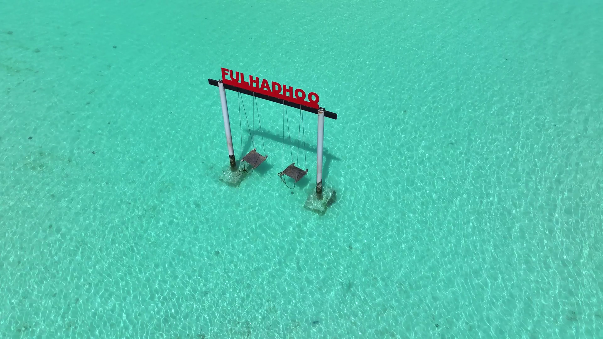Aerial View Of A Sign With The Name Fulhadhoo Above Two Swings In Crystal Clear Turquoise Water A Tropical Paradise Fulhadhoo Baa Atoll MaldivesÂ