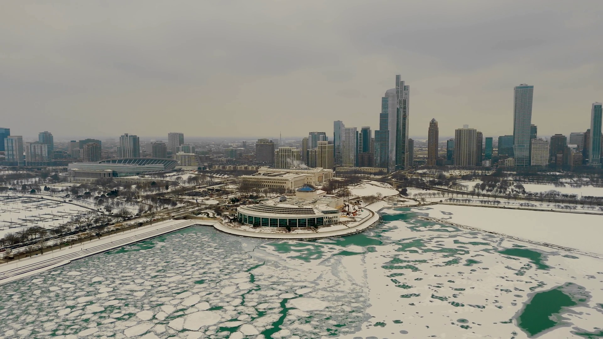 Aerial View Of A Snowy Marina On Urban Chicago Skyline Frozen Lake Towering Buildings In The Background Empty Docks With Patches Of IcyÂ