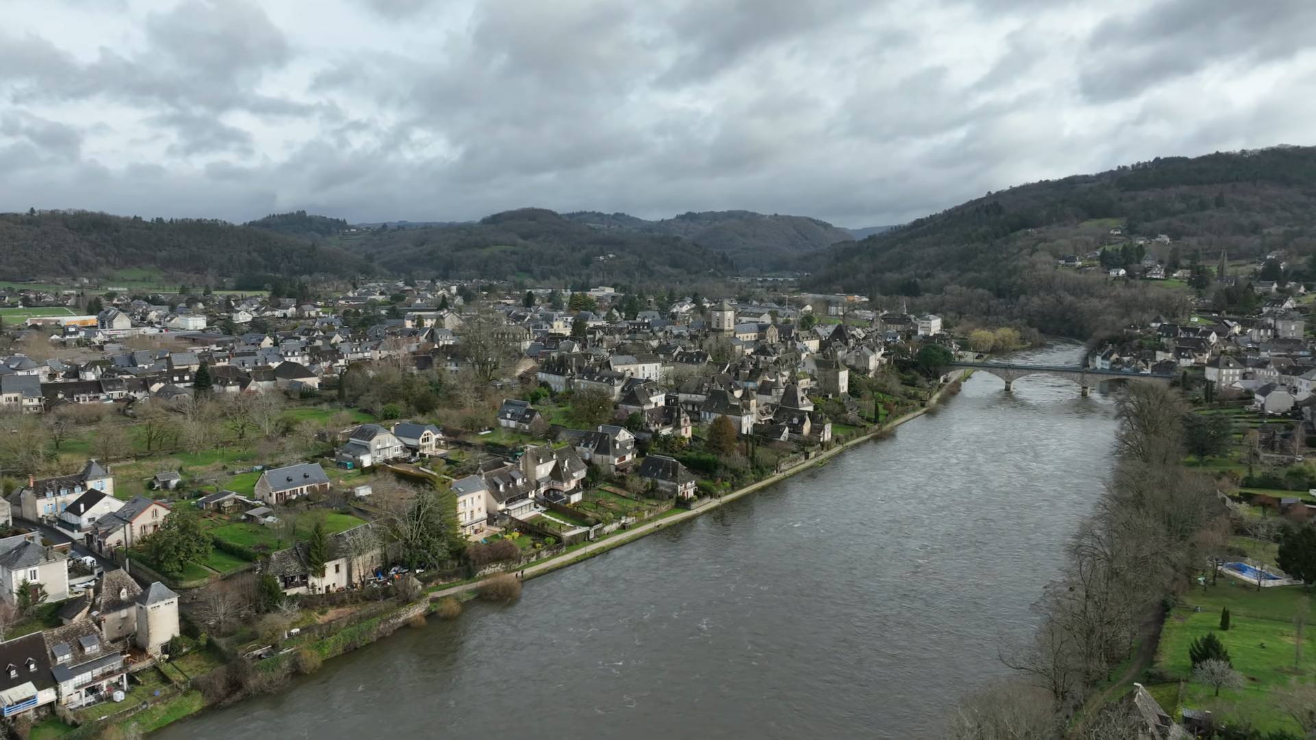 Aerial View Of Argentat Sur Dordogne With Historic Town Buildings Along The Dordogne River And Stone Bridge Under Cloudy SkyÂ