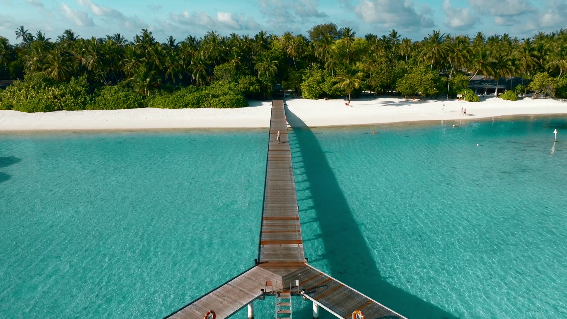 Aerial View Of Beautiful Beach Resort With Wooden Pier Palm Trees And Crystal Clear Turquoise Water Mahibadhoo South Ari Atoll MaldivesÂ