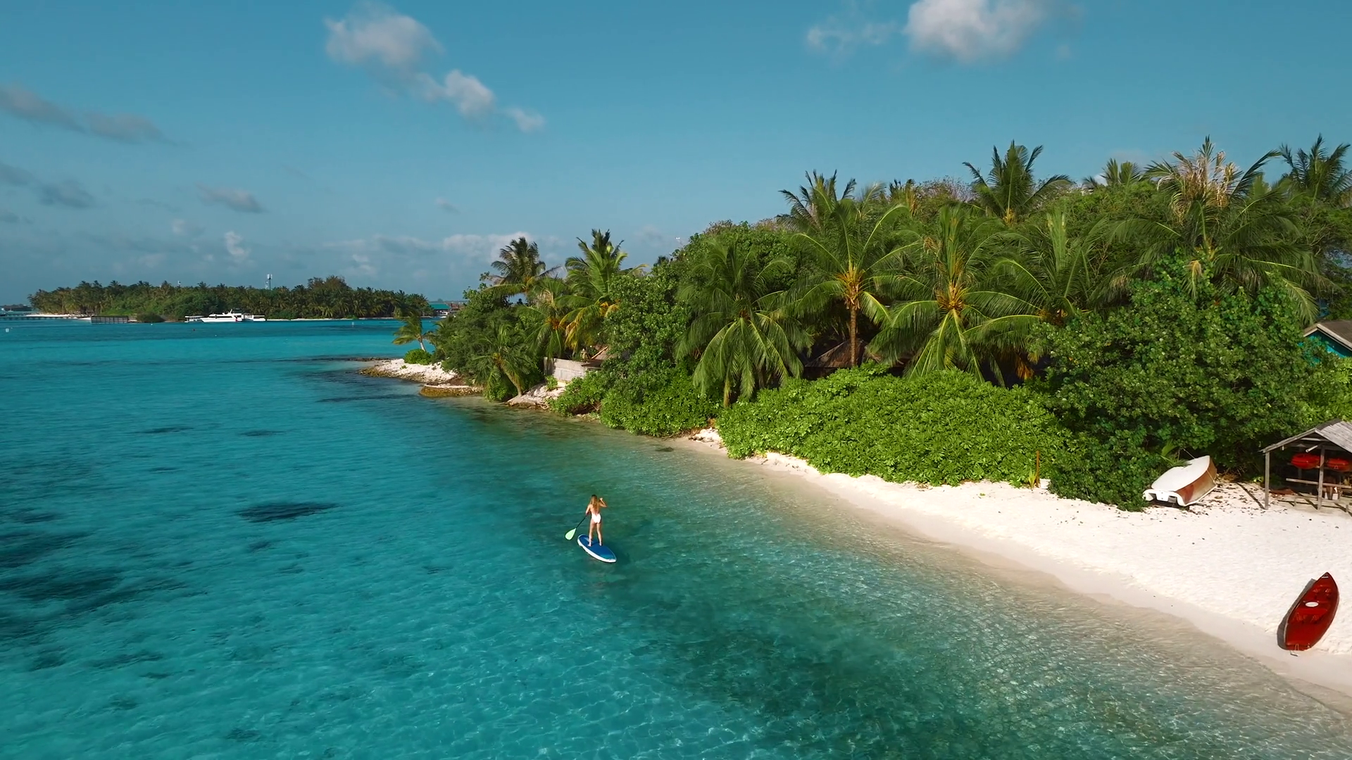 Aerial View Of Beautiful Maldives Beach With Woman Paddleboarding MaldivesÂ