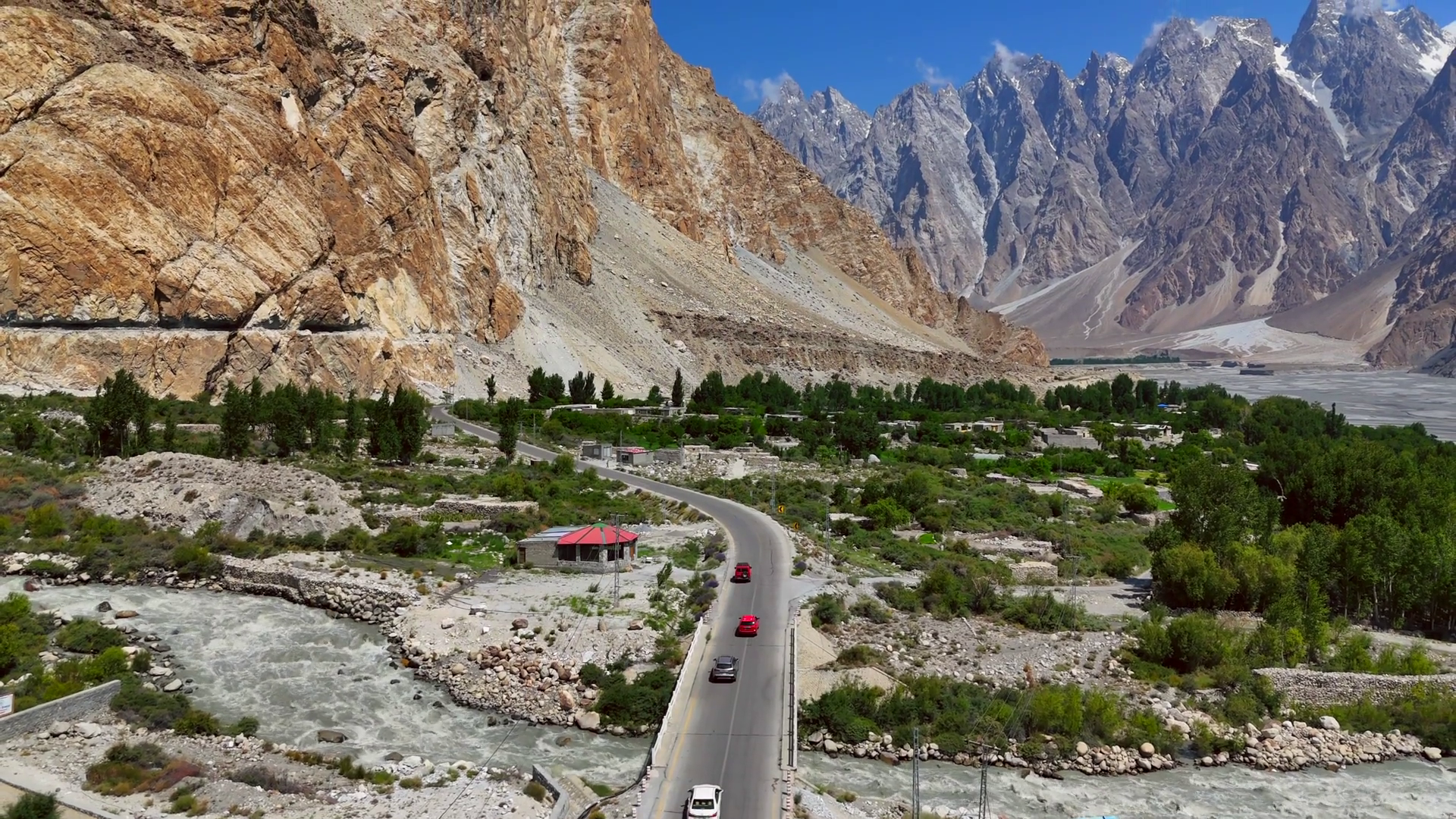 Aerial View Of Cars Driving On A Road Nestled Between A Rushing River And Towering Mountains Displaying A Stunning Contrast Of Natural Elements PakistanÂ
