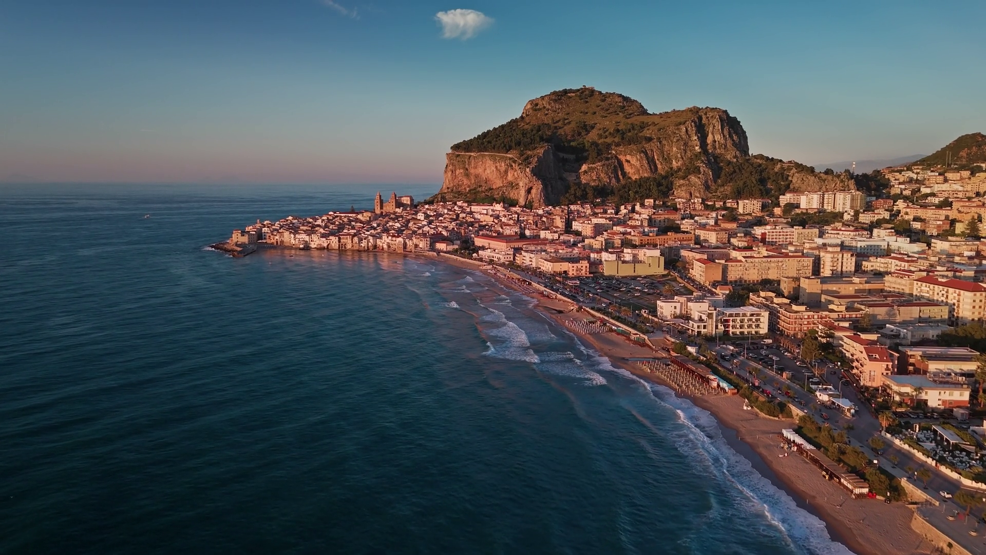 Aerial View Of Cefalu At Dusk A Drone Shot Over The Calm Tyrrhenian Sea Revealing The Old Town And Cathedral With Terracotta Rooftops Along The Coastline Sicily ItalyÂ