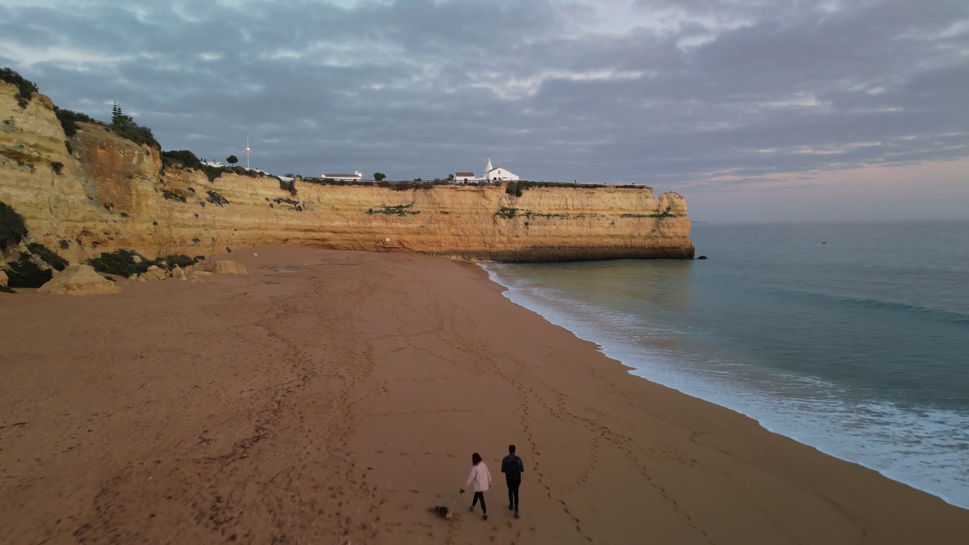 Aerial View Of Couple Walking With Dog On Beach With Cliffside And Ocean At Sunset Ermida De Nossa Senhora Da Rocha Algarve PortugalÂ