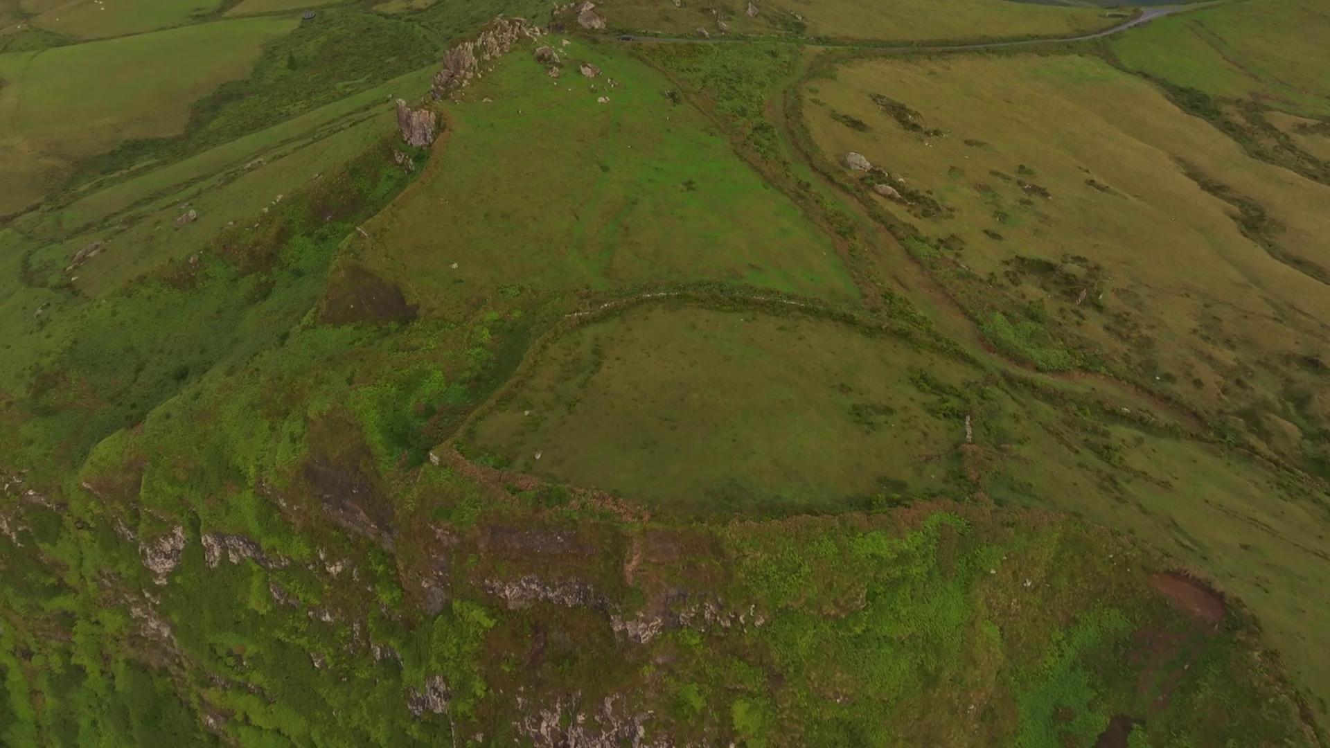 Aerial View Of Hill With Rocks And Road At Sunrise Rocha Dos Frades Flores PortugalÂ