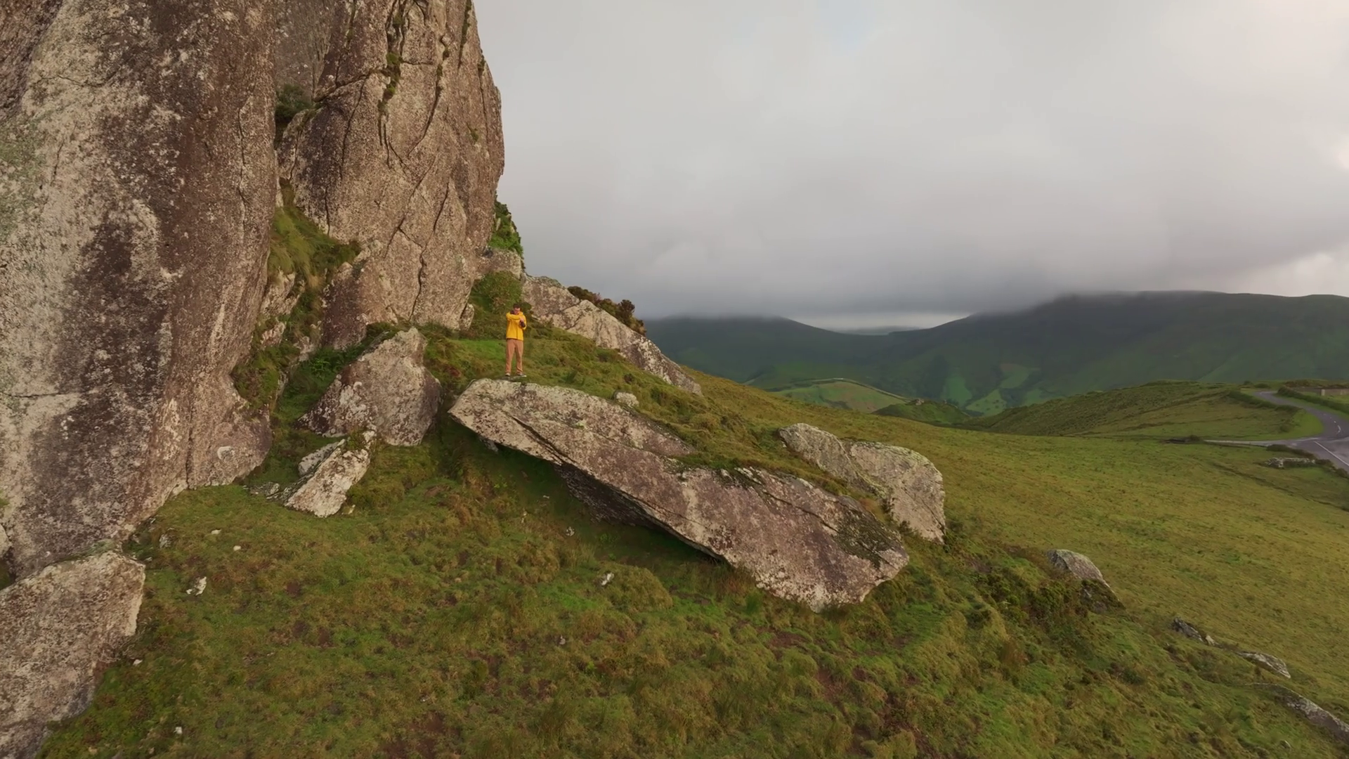 Aerial View Of Lush Landscape With Vertical Rocks And Photographer Rocha Dos Frades Flores PortugalÂ