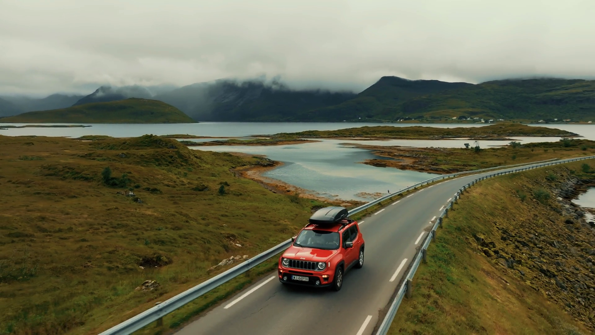 Aerial View Of Red Suv Driving In Beautiful Scandinavian LandscapeÂ