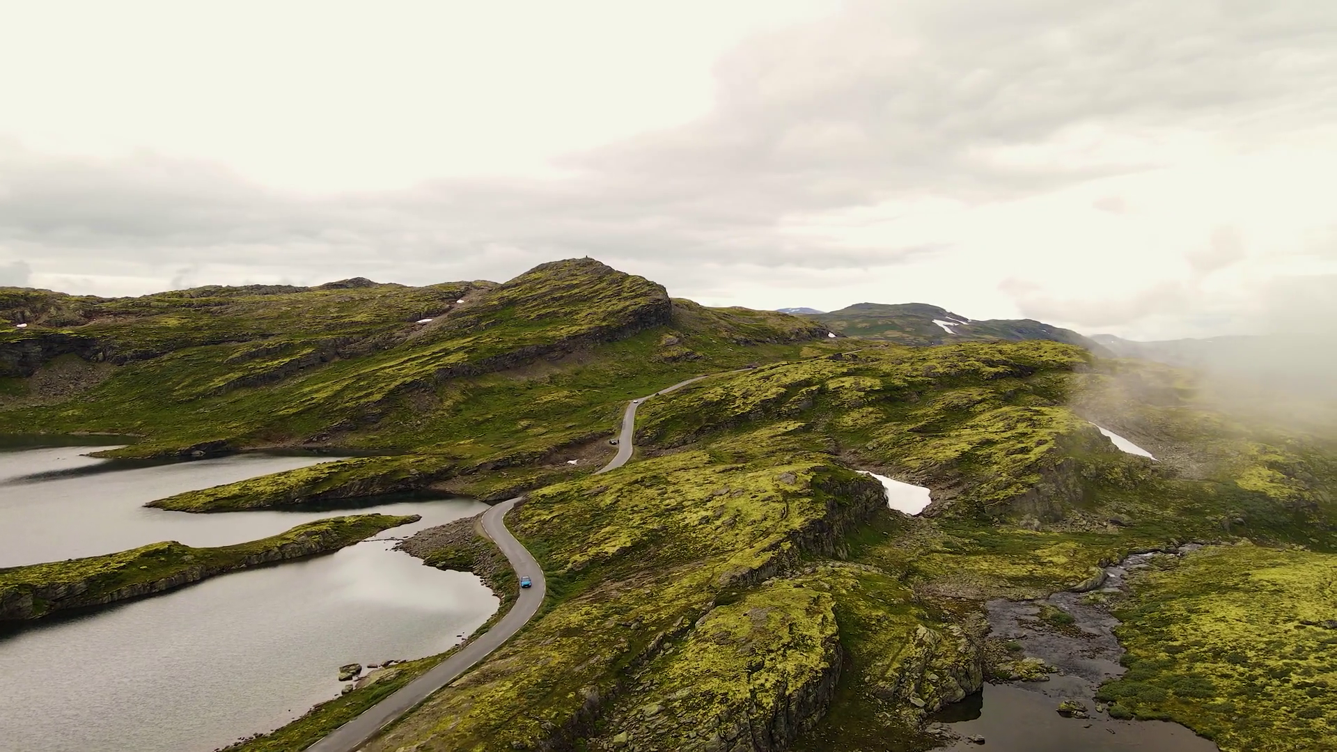 Aerial View Of Rugged Mountains A Blanket Of Green Moss And Patches Of Snow All Under A Sky Heavy With Clouds Laerdal Vestland NorwayÂ