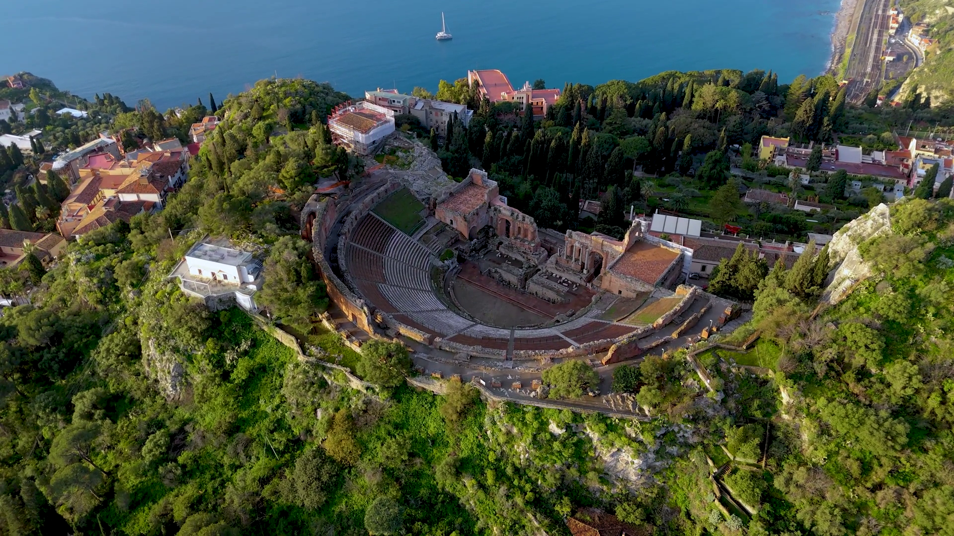 Aerial View Of Teatro Antico Di Taormina During Sunrise Island Of Sicily ItalyÂ