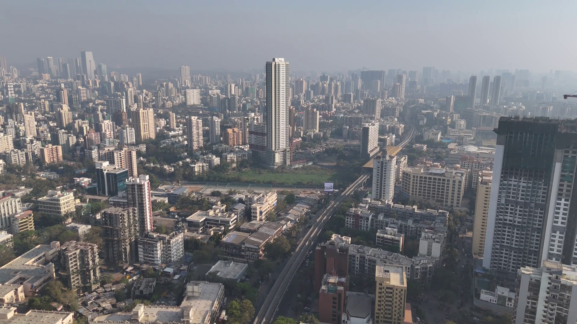 Aerial View Of The Dense Cityscape With Buildings And A Railway Track Cutting Through The Urban Landscape Mumbai Maharashtra IndiaÂ