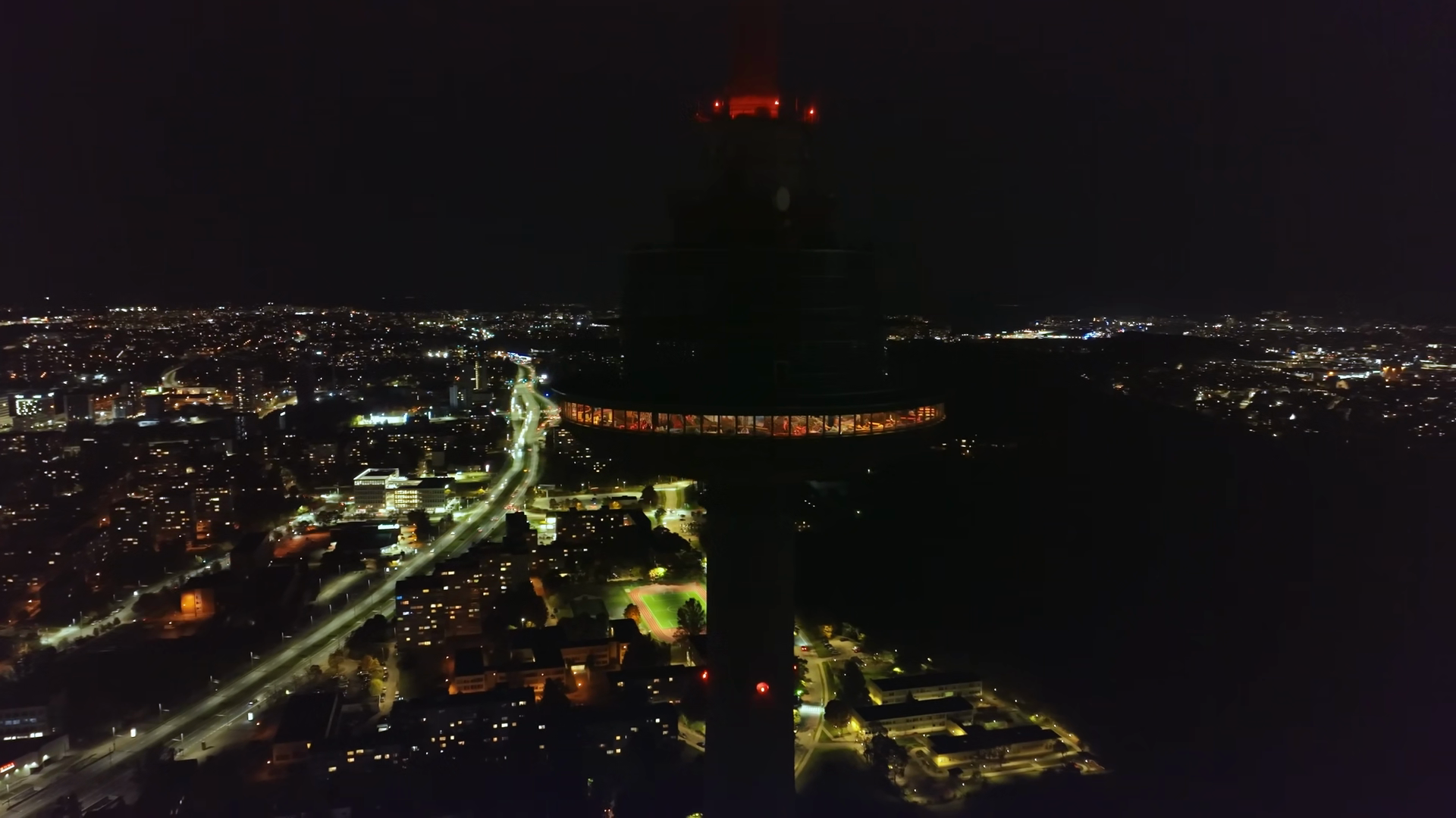 Aerial View Of The Illuminated Vilnius Tv Tower At Night Surrounded By Glowing City Streets And Buildings In The Karoliniskes District Of VilniusÂ