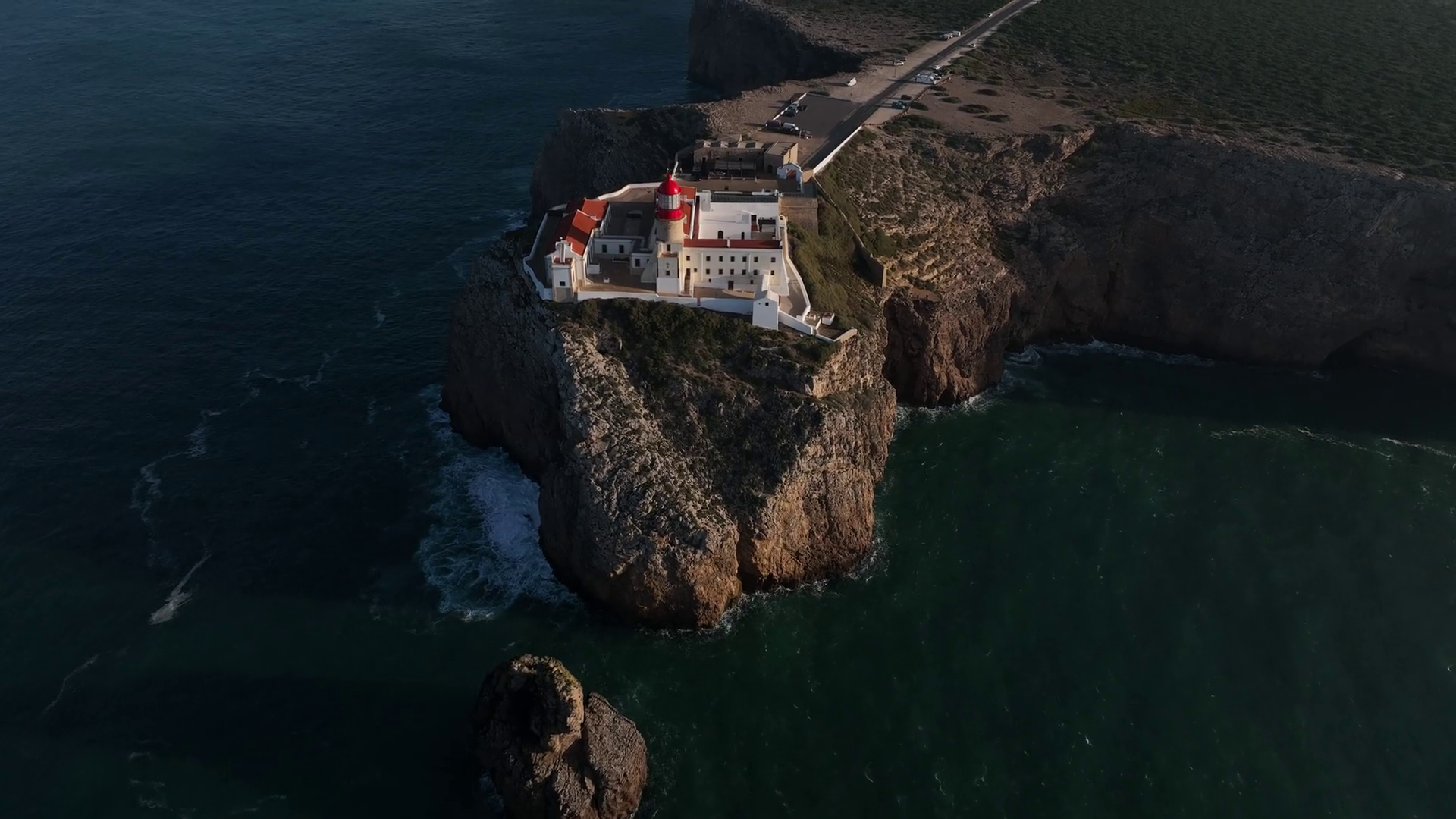Aerial View Of The Lighthouse Cabo De Sao Vicente Perched Atop Rugged Cliffs Contrasting With The Deep Blue Ocean Sagres Faro PortugalÂ