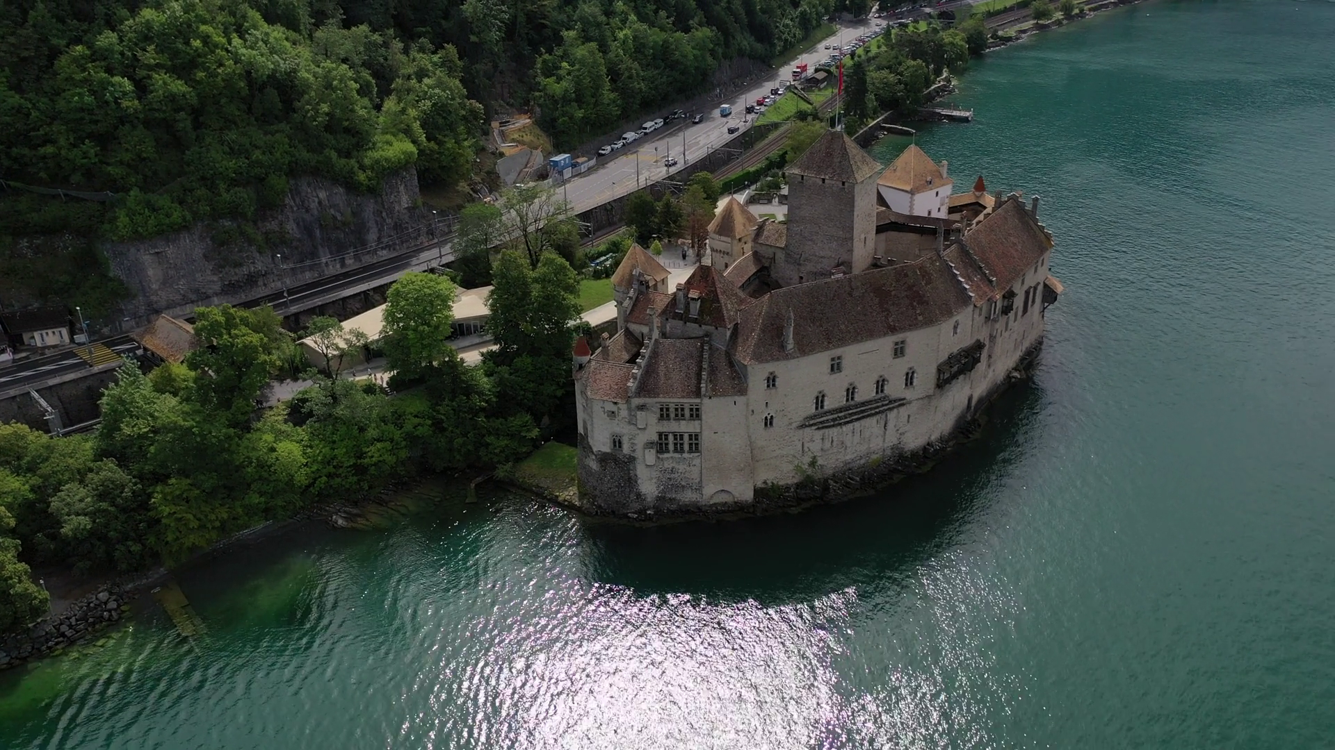 Aerial View Of The Medieval Chillon Castle With Its Stone Walls Standing Majestically On The Edge Of Lake Geneva Surrounded By Lush Green Trees Veytaux Vaud SwitzerlandÂ