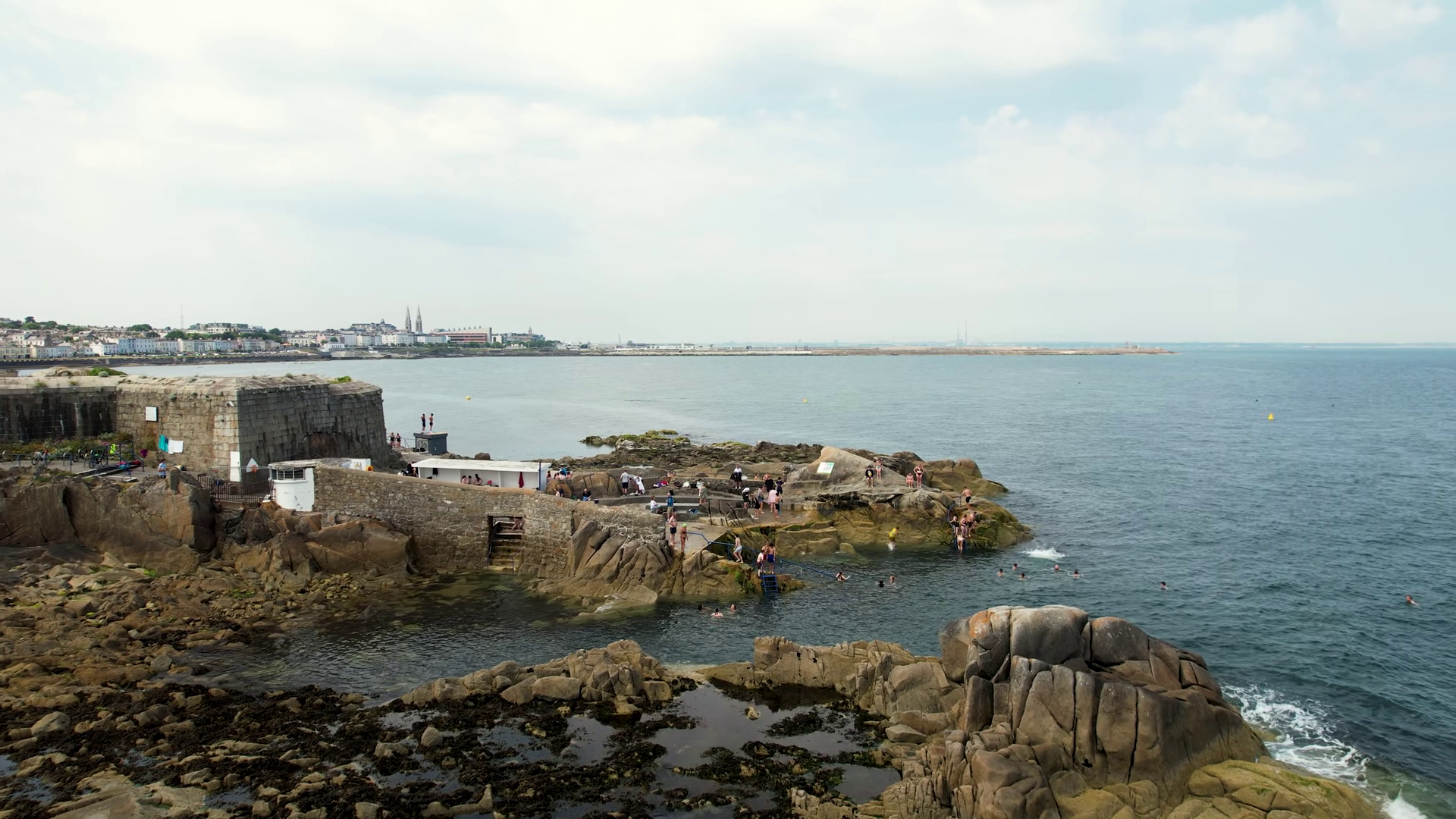 Aerial View Of The Rocky Forty Foot Coastline Meeting The Deep Blue Sea With People Gathering And Swimming In Its Waters Forty Foot Dublin IrelandÂ