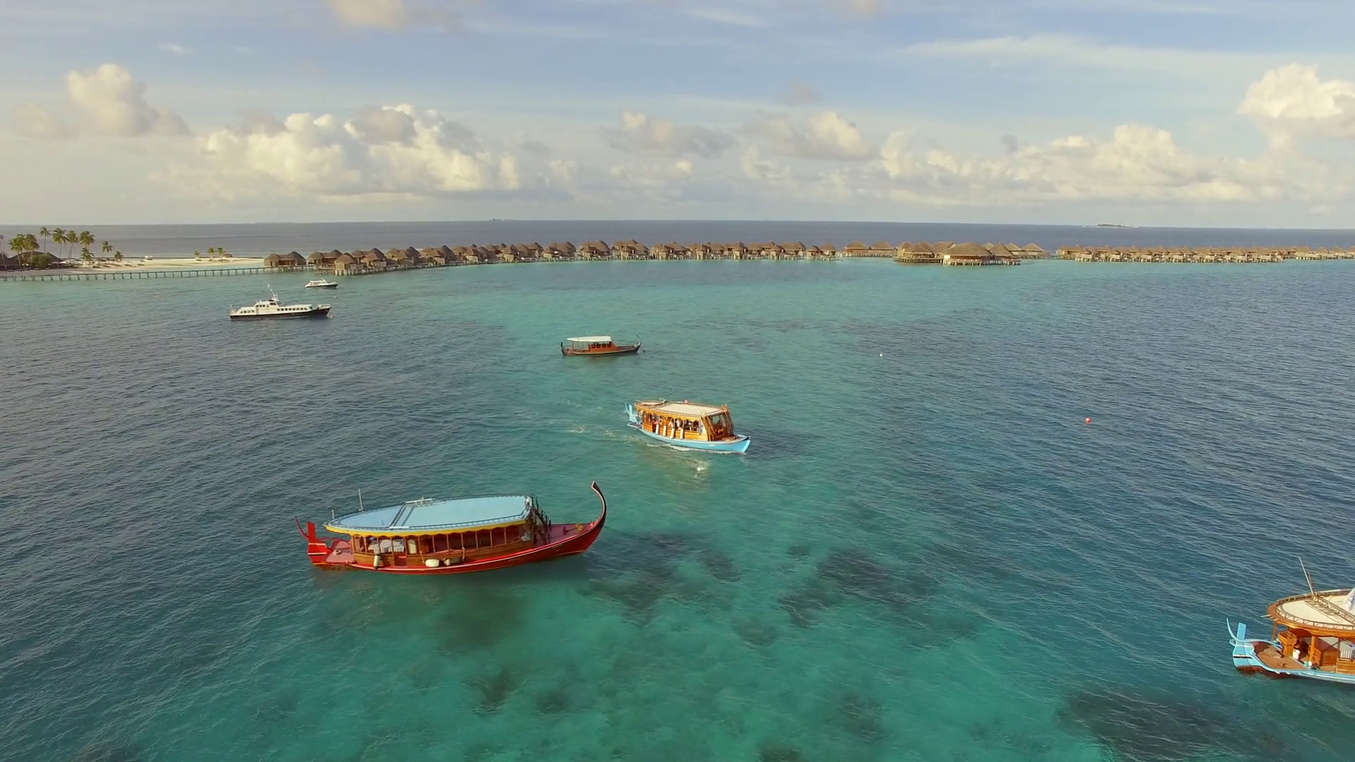 Aerial View Of Three Traditional Boats Anchored Next To Maldives IslandÂ
