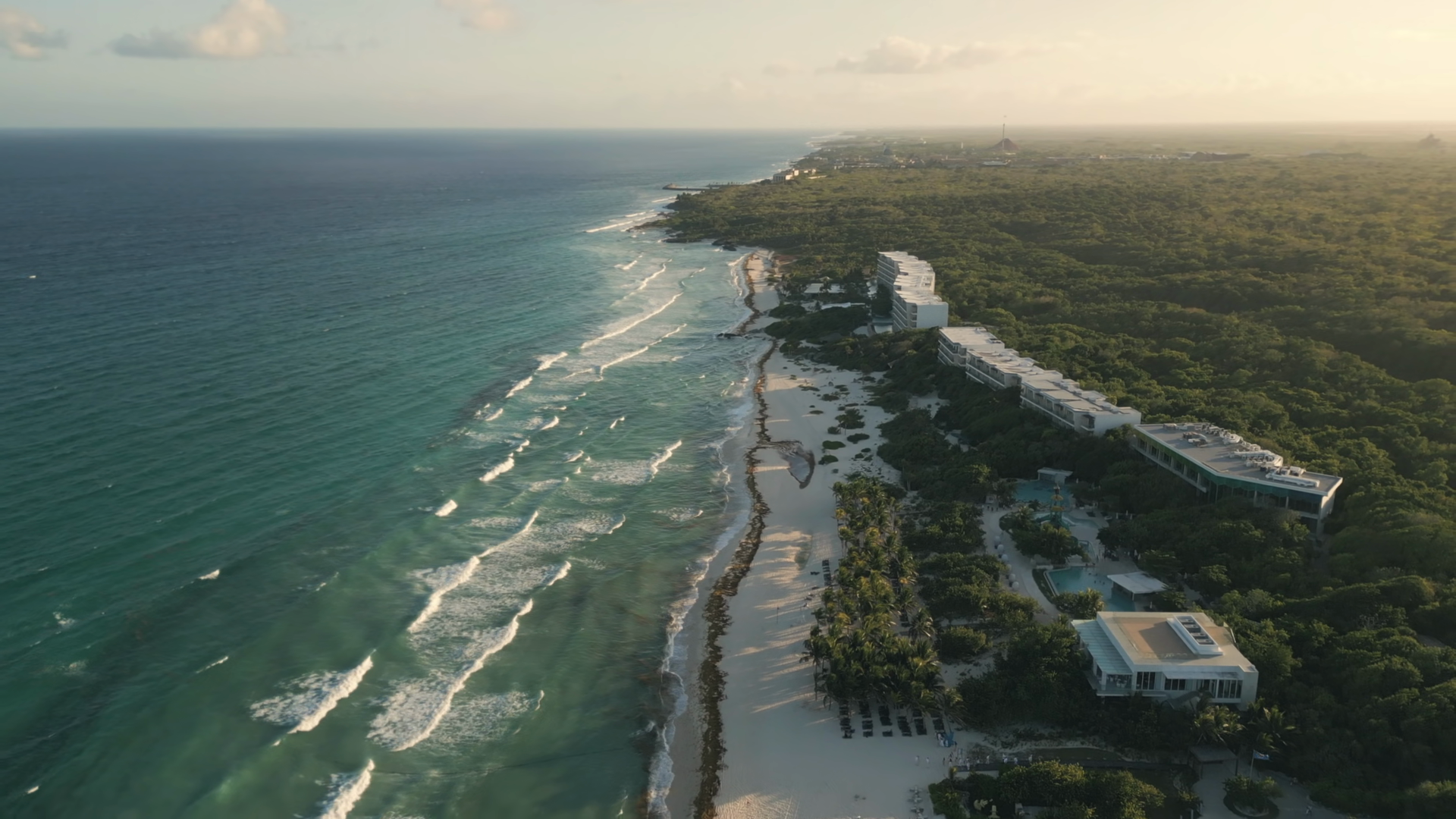 Aerial View Of Tropical Coastline With Beach Ocean And Resorts In Playa Del Carmen Mexico At SunriseÂ