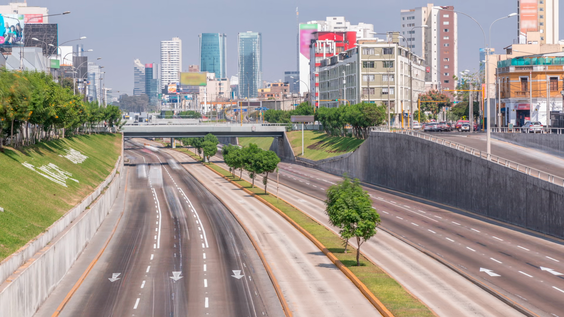 Aerial View Of Via Expresa Highway And Metropolitan Bus With Traffic Timelapse And Blue Sky With Clouds Lima Peru