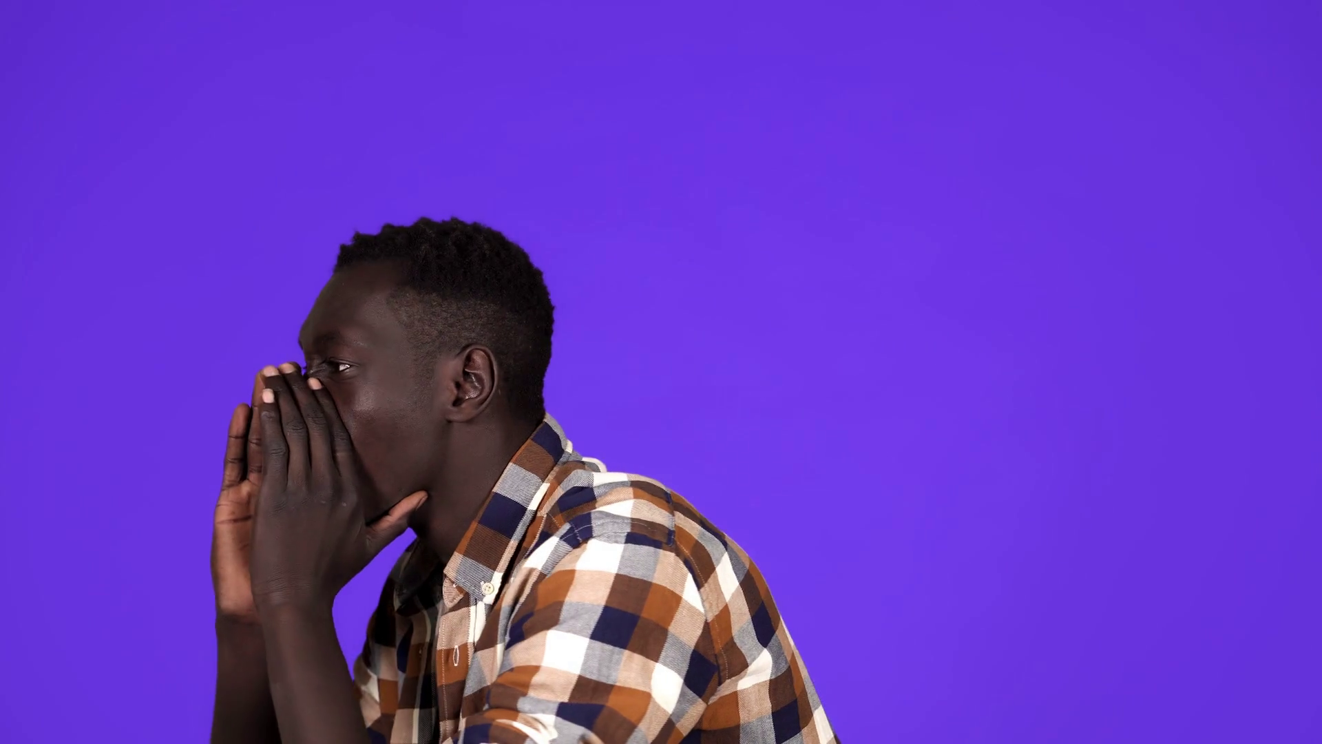 African American Man Making Loud Announcement At Copy Space Holding Hand Near His Open Mouth Over Blue Background Side ViewÂ