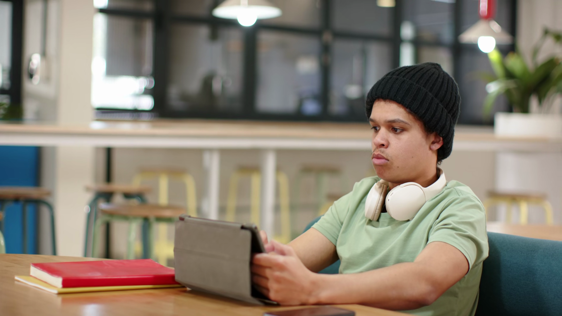 African American Man Sitting In Study Lounge Tilting Tablet Reacting To Tablet SmirkingÂ