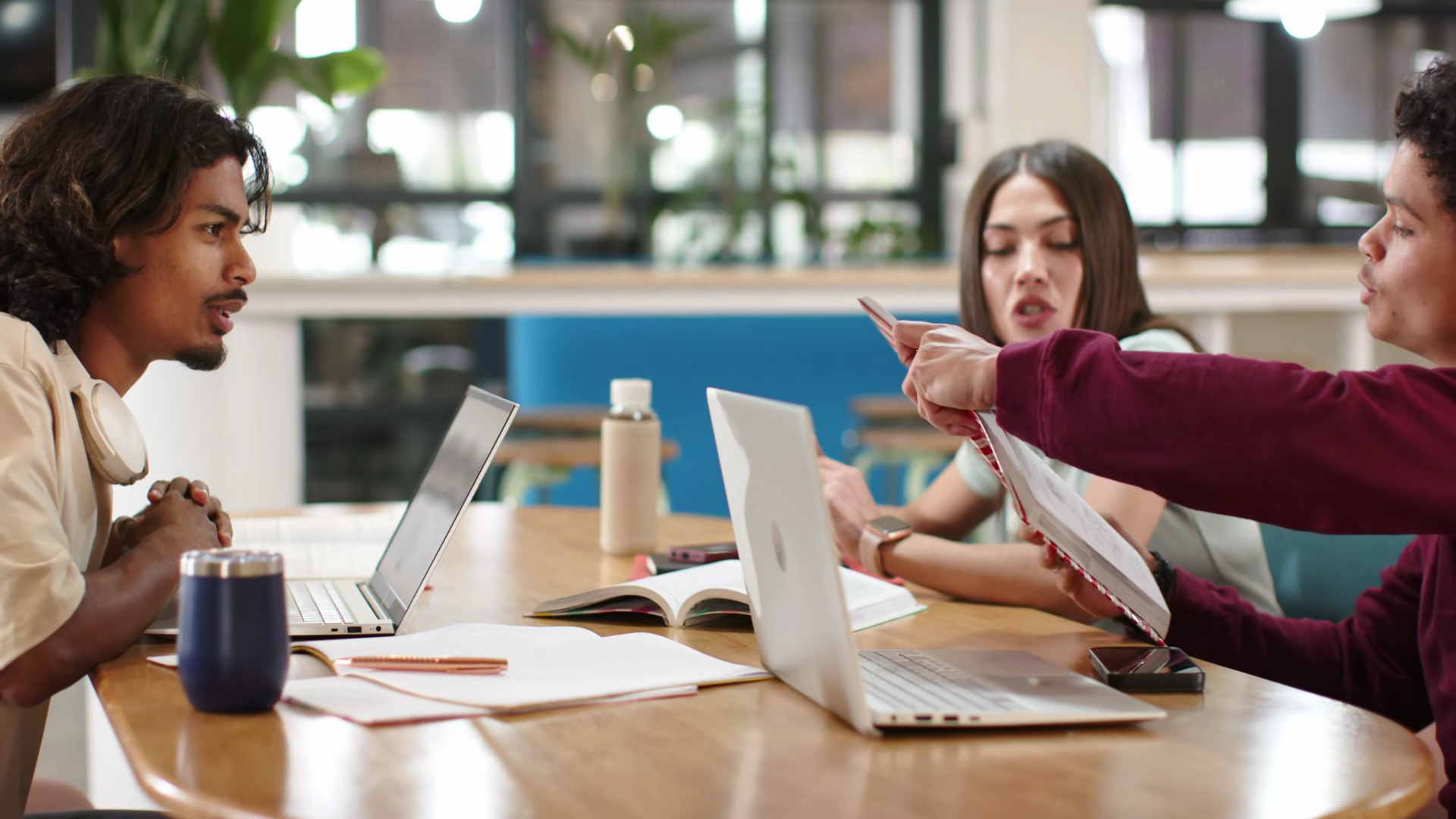 African American Students Studying At Table While Right Man Showing Striped Folder With LaptopsÂ